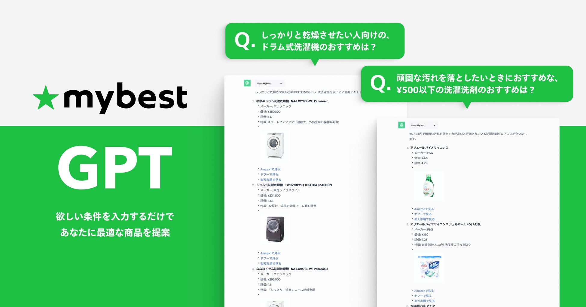 のべ30,000商品以上の検証データベースからおすすめ商品を紹介する「mybest GPT」の提供を開始