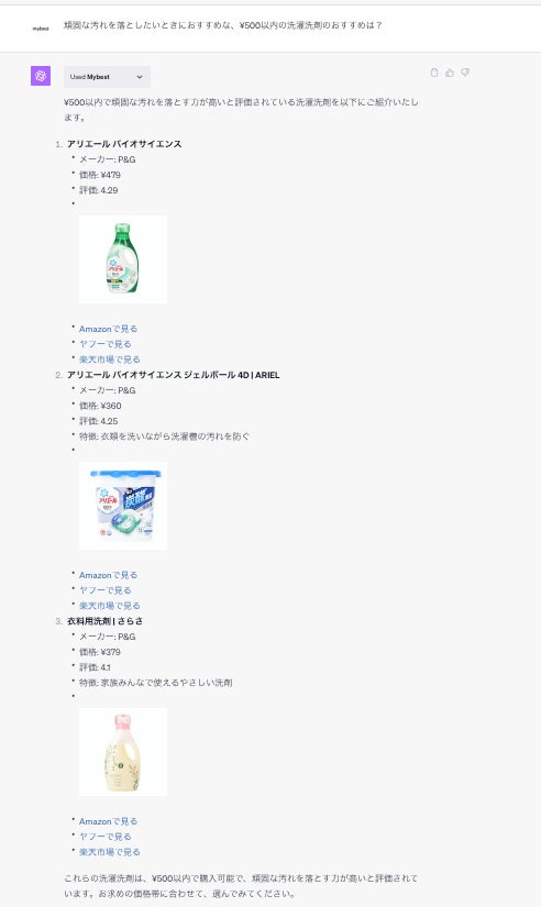 ▶️質問例:「頑固な汚れを落としたいときにおすすめな、¥500以内の洗濯洗剤のおすすめは?」と質問した場合