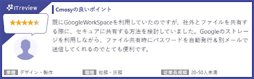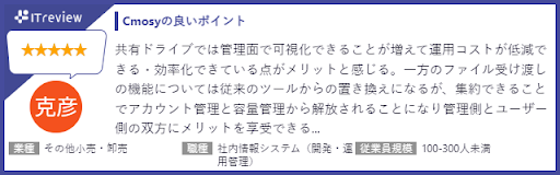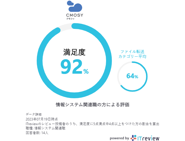 おかげさまで Cmosy はIT・広告・マスコミにお勤めの方による方や、情報システム関連職の方のご利用満足度が92%という評価を得ました。ファイル転送カテゴリの平均と比較しても高い満足度となっており、多くの管理者の方にご支持をいただいております。