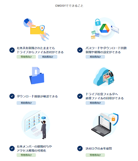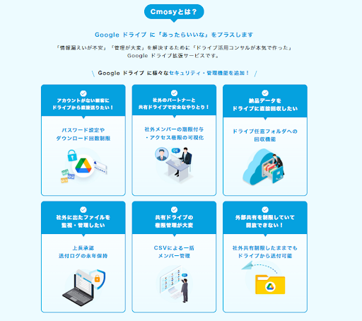 「 Cmosy 」は、吉積情報が共同で開発したファイル共有サービスです。Cmosy をご利用のお客様は Google Workspace のセキュリティポリシー(社外共有の禁止)を保持した状態でファイルを安全に社外と送受信することができます。また、共有ドライブの運用課題を解決する、権限可視化やアラート通知(ファイル数・共有期限日等)機能等、お客様の Google Workspace* 運用をサポートする様々な機能を提供しています。