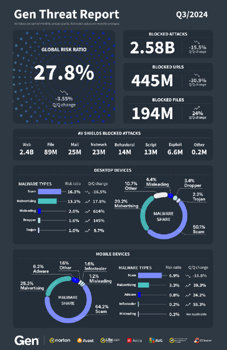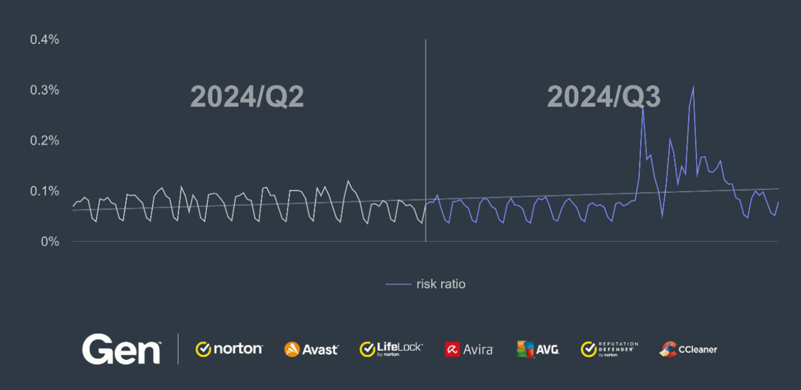 2024年第3四半期には、Lumma Stealerによって配信された大規模なキャンペーンにより、情報窃取に感染するリスクが39%増加しました。2024年第3四半期における情報窃取型不正プログラムのユーザーベースに対する日次リスク比率が、日本は128%と世界で2番目を記録しました。