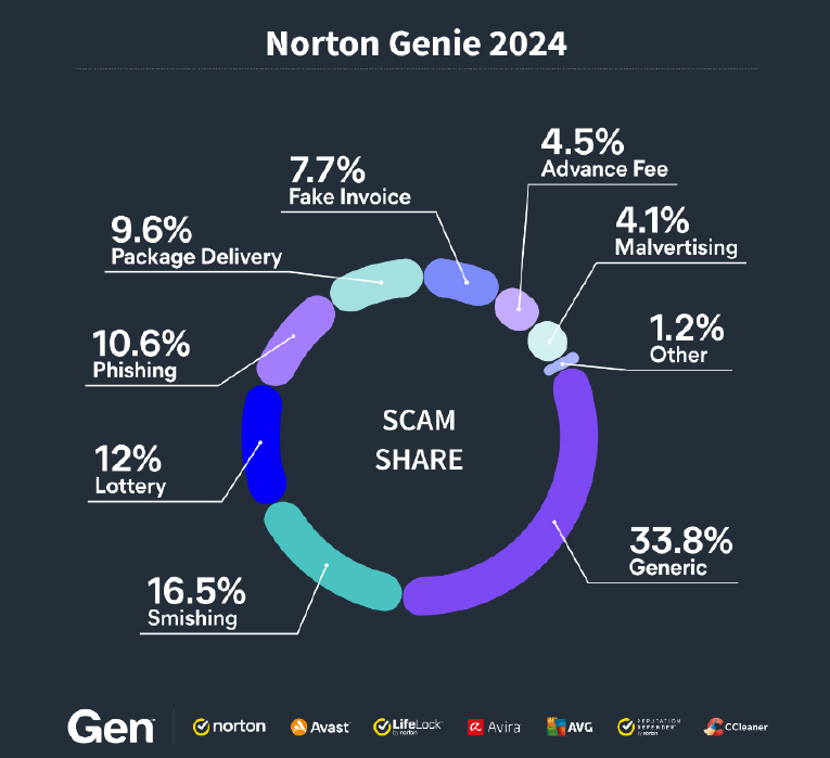 Norton Genie(詐欺検出ツール)は、2024年現在までに検出した脅威を、テレメトリーデータに基づいて発表しました。サイバー犯罪者たちは進化し続けており、消費者を騙す新しい手口を次々に見つけています。これらの脅威は、システムの脆弱性や人間の心理を悪用するなど、さまざまな方法で現れます。以下は、Norton Genieが検出した中で最も多く見られた詐欺の種類についての詳細です。
