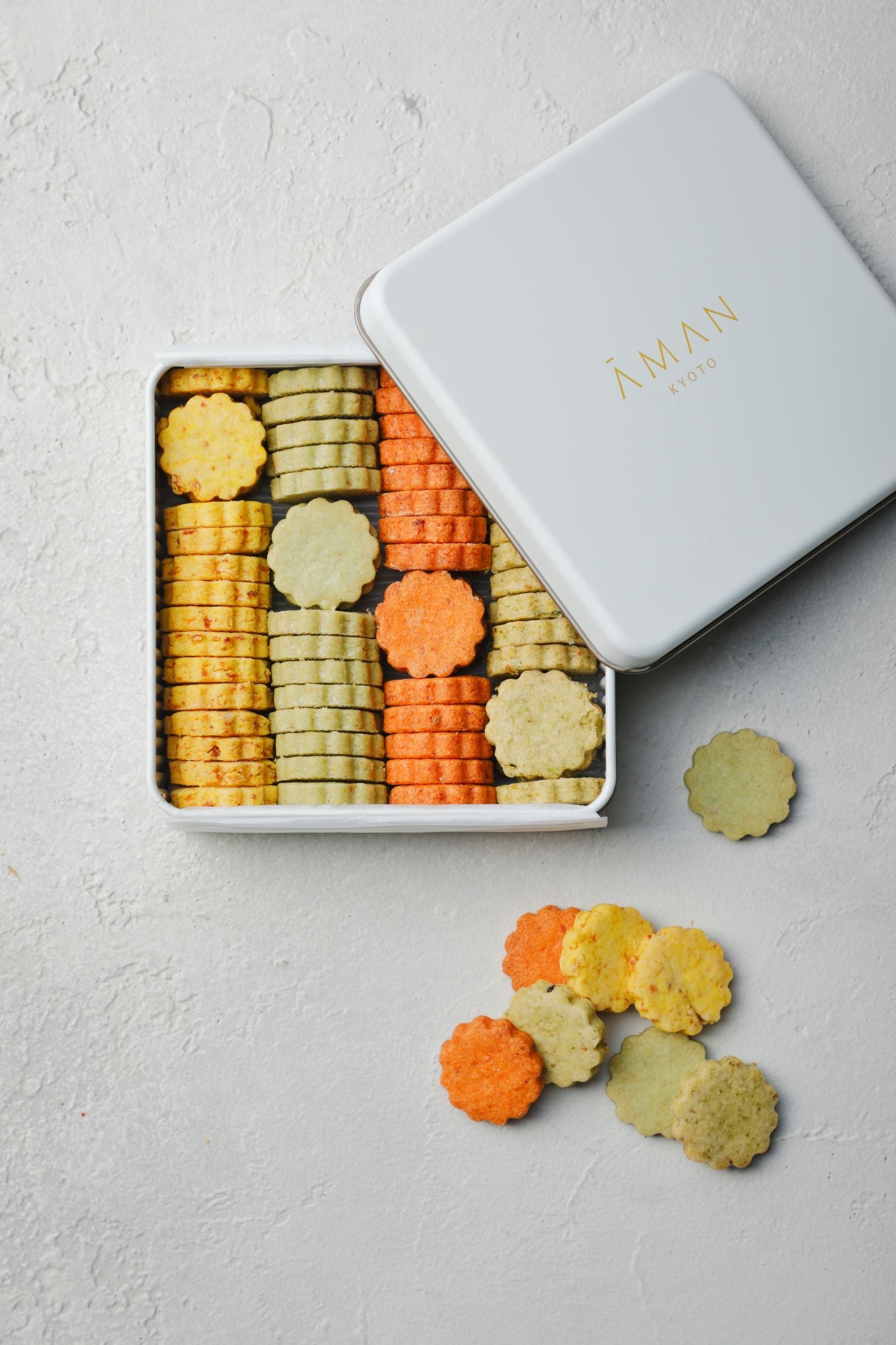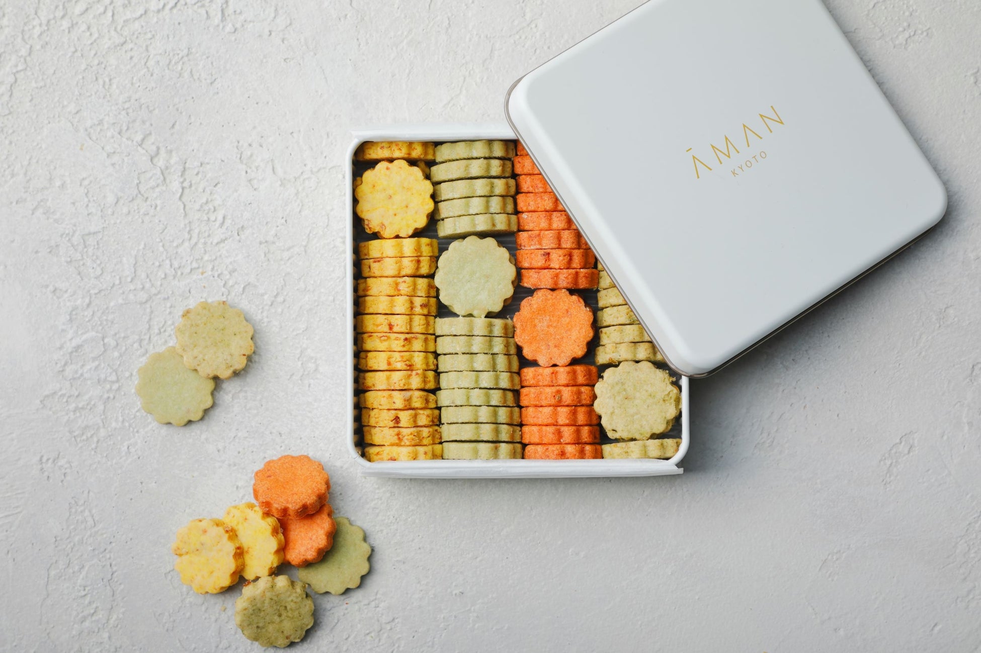 ト」、「賀茂ネギ」の4種の野菜を使った「上賀茂野菜のサブレ」を2024年8月1日(木)から新発売いたします。アマン京都のロゴをあしらった缶に、赤や黄、緑など、彩り豊かなサブレを68枚お詰めしました。野菜の自然の風味を生かした、アマン京都ならではのオリジナルサブレをお楽しみください。ご自宅で夕涼みを楽しむ夏のアペリティフにも、大切な方への贈り物にもおすすめです。