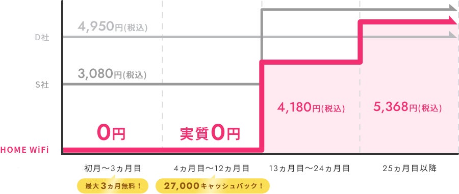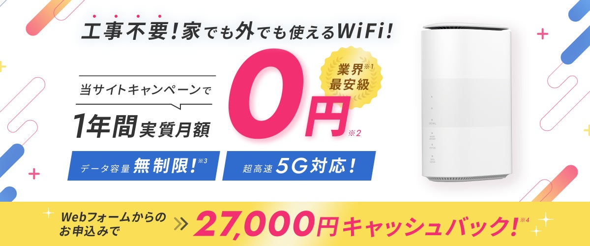 ずっとネット HOME WiFiは、『HOME WiFiのスタートキャンペーン』適用&キャッシュバックでWiFiが1年間実質月額0円で始められます。
