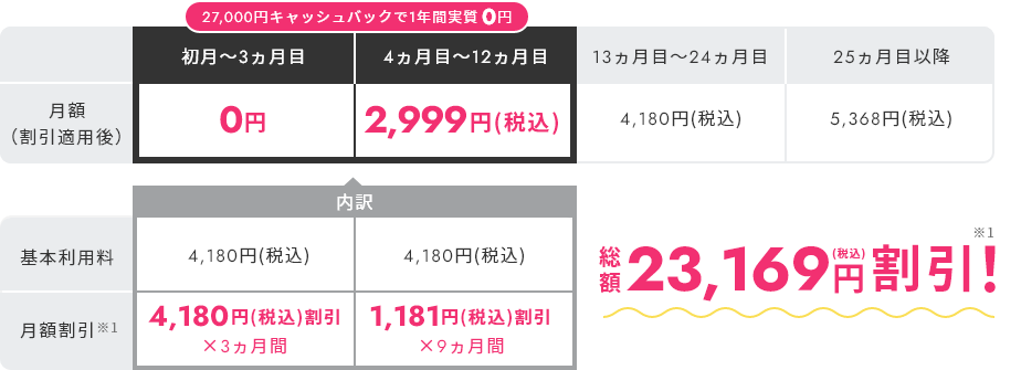 ・月額料金から最大23,169円(税込)割引されます。