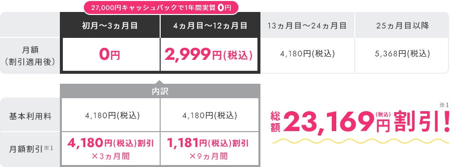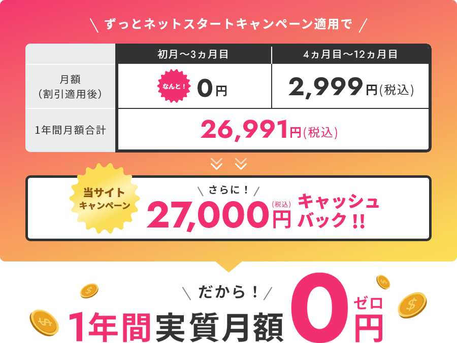 『ずっとネットスタートキャンペーン』適用、そしてキャンペーン適用後にもらえるキャッシュバックによって、1年間の利用料金が実質無料になります。