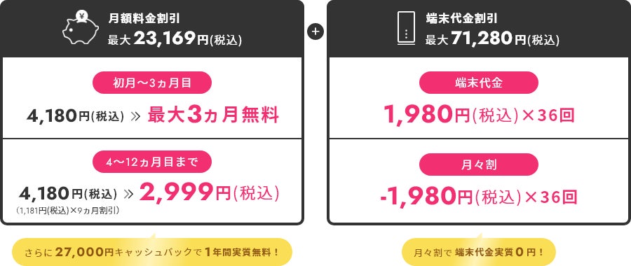 ・端末代(− 1,980円(税込) × 36回)割引で、端末が実質無料となります。
