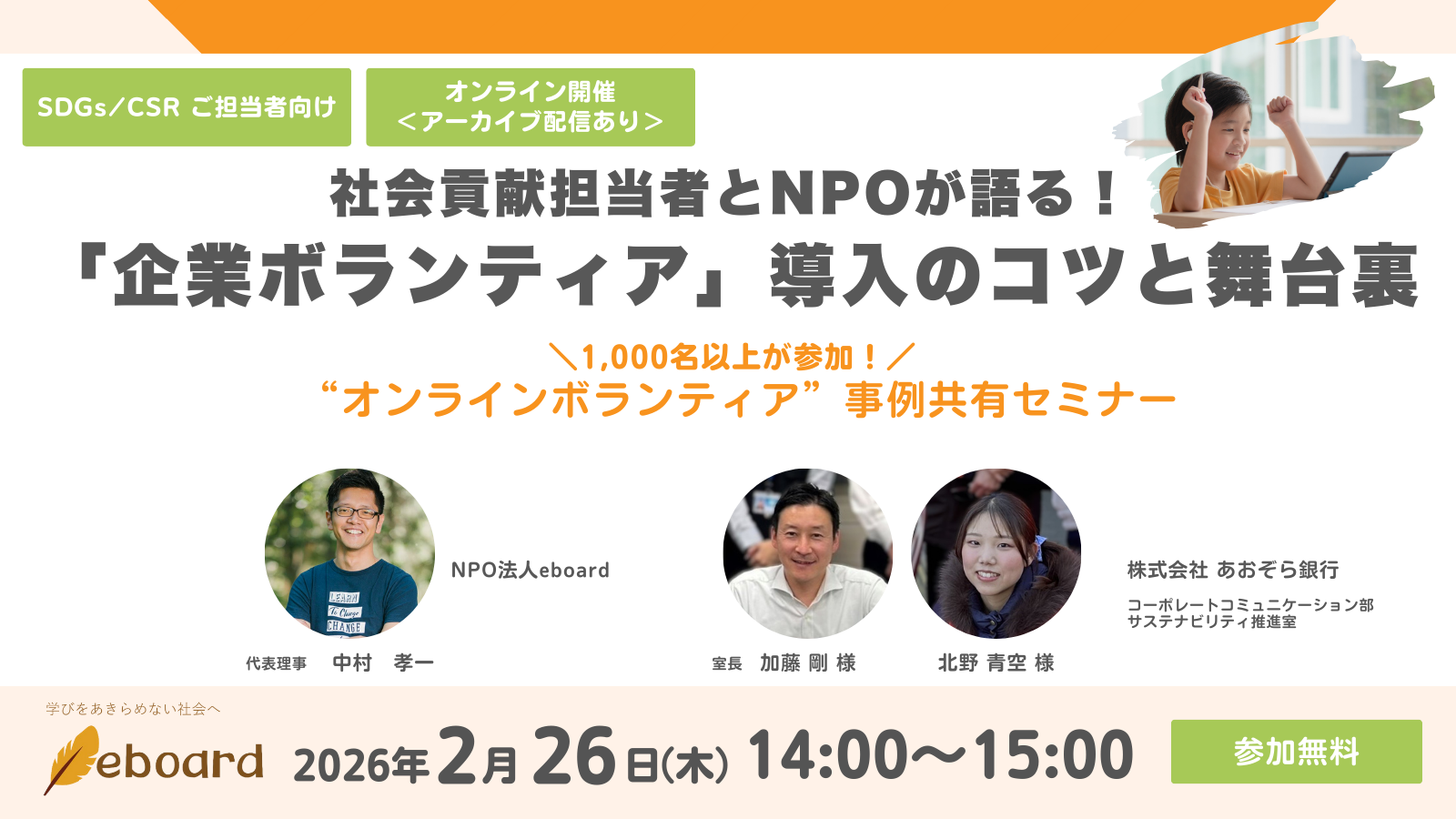 「学びをあきらめない社会」をミッションに活動するNPO法人eboard(イーボード)は、2026年2月26日(木)、株式会社あおぞら銀行のサステナビリティ推進室担当者をゲストに迎え、「企業ボランティア」導入のコツと舞台裏をお聞きするオンラインセミナーを開催します。