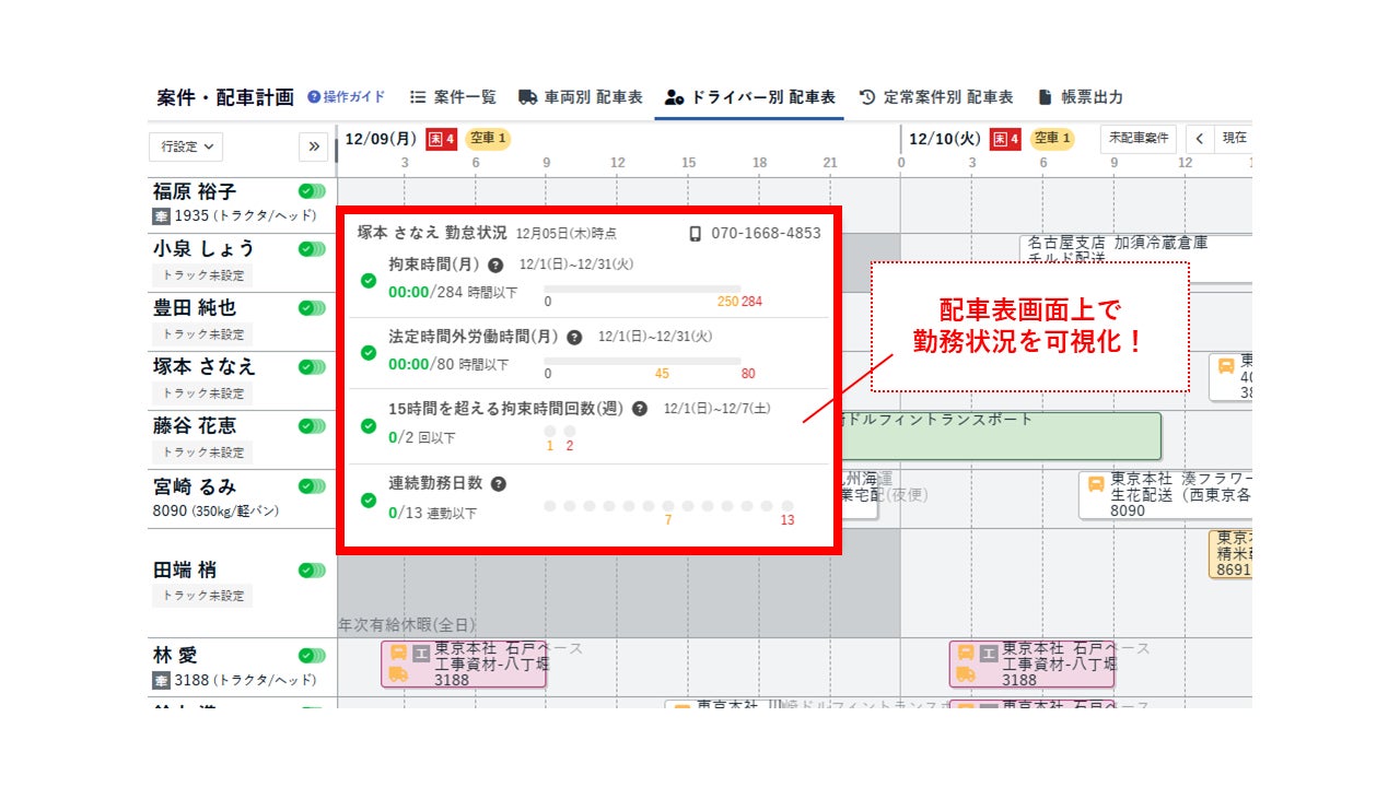 配車組みの際、ドライバーの勤務状況を確認しながらの配車調整が可能です。細かな労務管理ルールや、ドライバー一人ひとりの勤務記録を確認する手間を省略できます。
