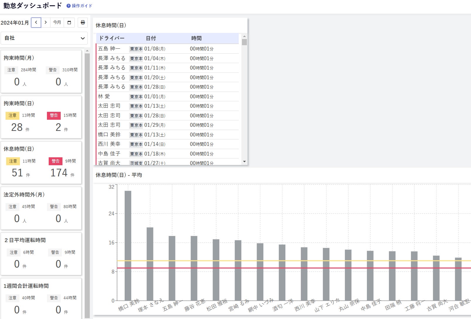 また、ダッシュボード機能も付いており、労基法やトラック運送に適用されるルールである改善基準告示に照らした運用ができているか、全社の状況を一目で確認することも可能です。
