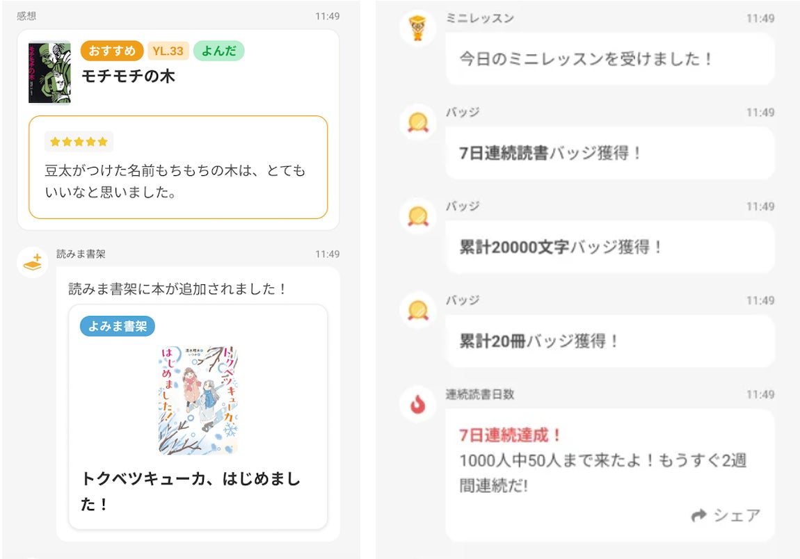ホーム画面では、読んだ本や実施したミニレッスンなどの進捗が簡単に確認でき、「今日はどんな本を読んだか」「どんな取り組みをしたか」が一目でわかります。また、読後の感想も一覧で表示され、感想の文章や内容の変化を通じて、興味や関心の変化、表現力や読解力