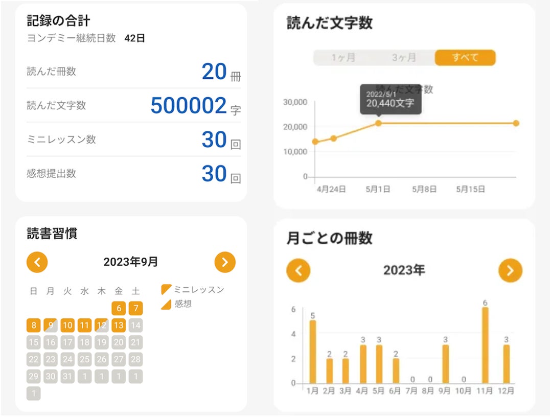 「読んだ冊数」や「読んだ文字数」、「ミニレッスン実施回数」などを数値やグラフで表示。これまでの読書量の積み重ねや成長を視覚的に振り返ることができます。