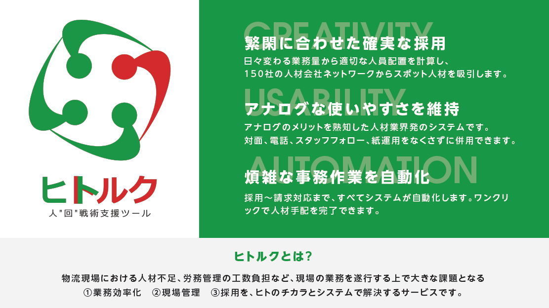 ヒトルク:物流現場における人材不足や労務管理の工数負担などの課題を解決する、物流・製造人材管理システムです。ヒトのチカラとシステムの両方の面からのサポートを行っているため、アナログな使いやすさを維持しつつワンクロックで人材手配を完了することができます。トップギア採用から請求書対応などの煩雑な事務管理まで、一括で管理することが可能です。