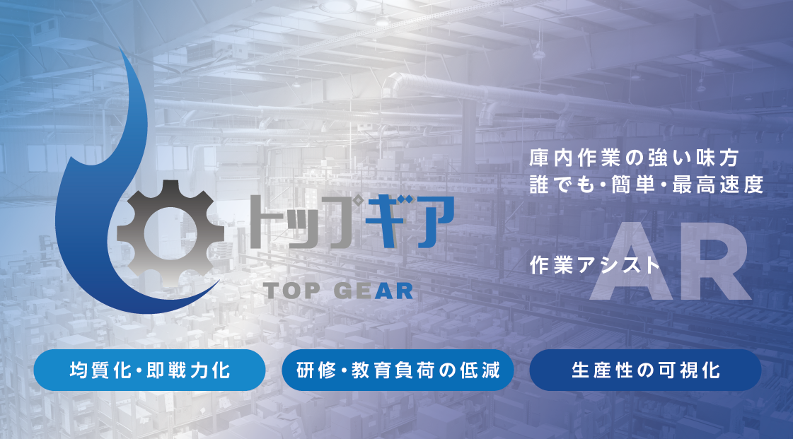 トップギア:ARグラスと連携した作業アシストサービスです。ARグラスがQRコードを読み取ることで仕分け作業をサポートするため、作業の均質化や新人の即戦力化に有効です。また、頻繁に変更されるマニュアルを自動でAR動画化し、バーチャルキャラクターによって分かりやすく解説したり、作業量を自動で集計し、個人の生産性を可視化することも可能です。