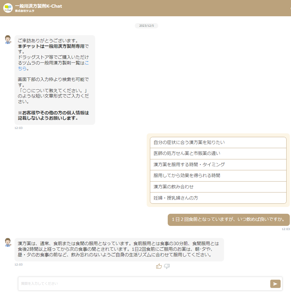 今回は、ユーザーに対して正確性の高い情報提供を行うことを考え、最終的な回答にはAI生成を使用せず、入力された質問文の意味をAIが解析してナレッジデータ上の最適な回答を特定し、回答出力を行う機能を使用していただいております。ツムラ様では、これまで医療関係者向けにAIチャットサービスを提供されておりましたが、このたび新たに一般用漢方製剤を利用するユーザーに対して、MediaTalkGAIによるAIチャットサービスの提供を開始するに至りました。今後も「一般用漢方製剤K-Chat」による一般用漢方製剤ユーザーの利便性向上に寄与できるようにサービス品質の向上・改善へ努めて参ります。
