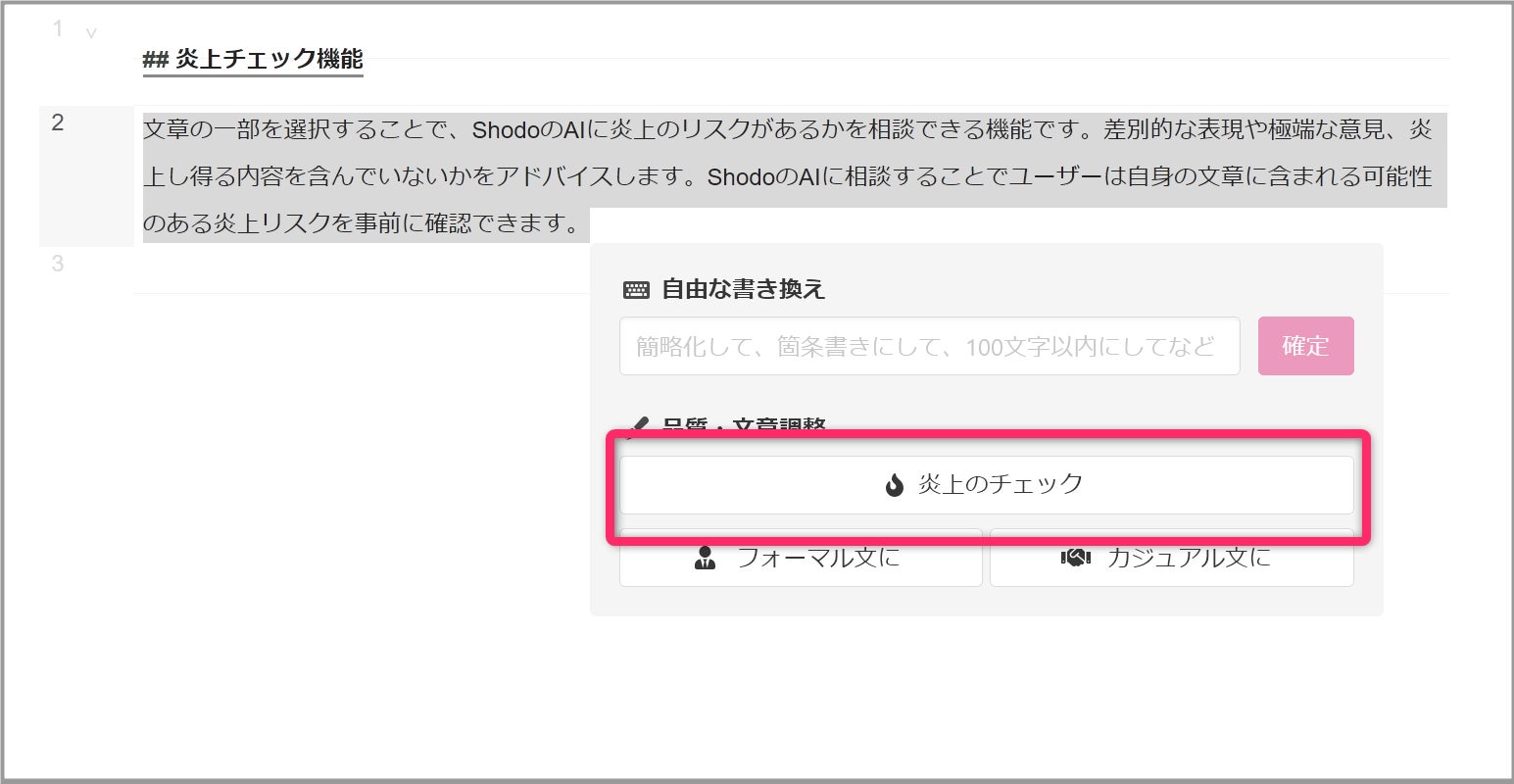 文章の一部を選択することで、ShodoのAIに炎上のリスクがあるかを相談できる機能です。問題となりえる差別的な表現や極端な意見、炎上の可能性のある内容を含んでいないかのアドバイスを受けられます。ShodoのAIに相談することでユーザーは自身の文章に含まれる可能性のある炎上リスクを事前に確認できます。