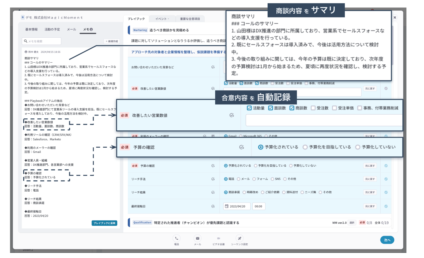 Magic Moment Playbook は、営業チームが効率的に顧客との関係構築を行うためのRevenue Platformです。AIによる Next Best Action、パーソナライズされたコミュニケーション、煩雑だが重要なタスクの自動化、最適な営業プロセスを示すプレイブック機能で、新規顧客獲得、顧客関係の深化を支援し、営業組織の成果最大化を実現します。