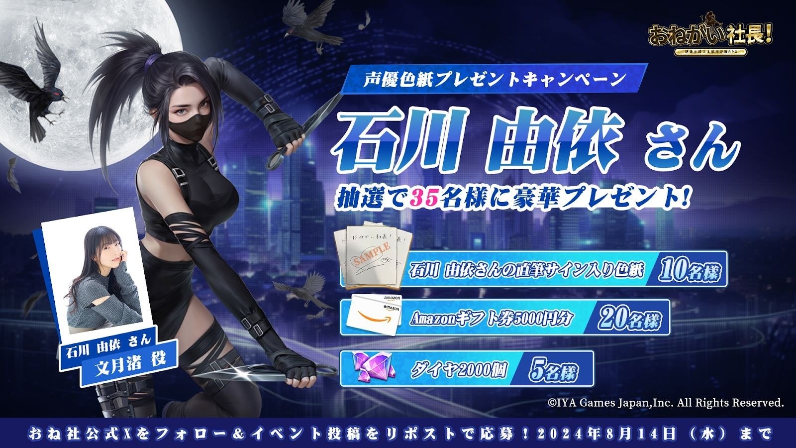抽選賞品:石川由依さんの直筆サイン入り色紙*10名様、Amazonギフト券5,000円分*20名様、ゲーム内ダイヤ2,000*5名様