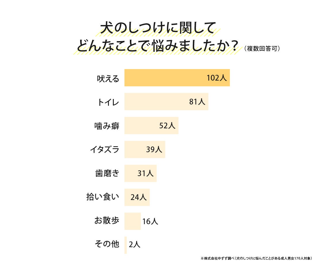 続いて、「犬のしつけに関してどんなことで悩みましたか?」というアンケートをとった結果、「吠え」に関することで悩んでいる飼い主さんがもっとも多いことがわかりました。