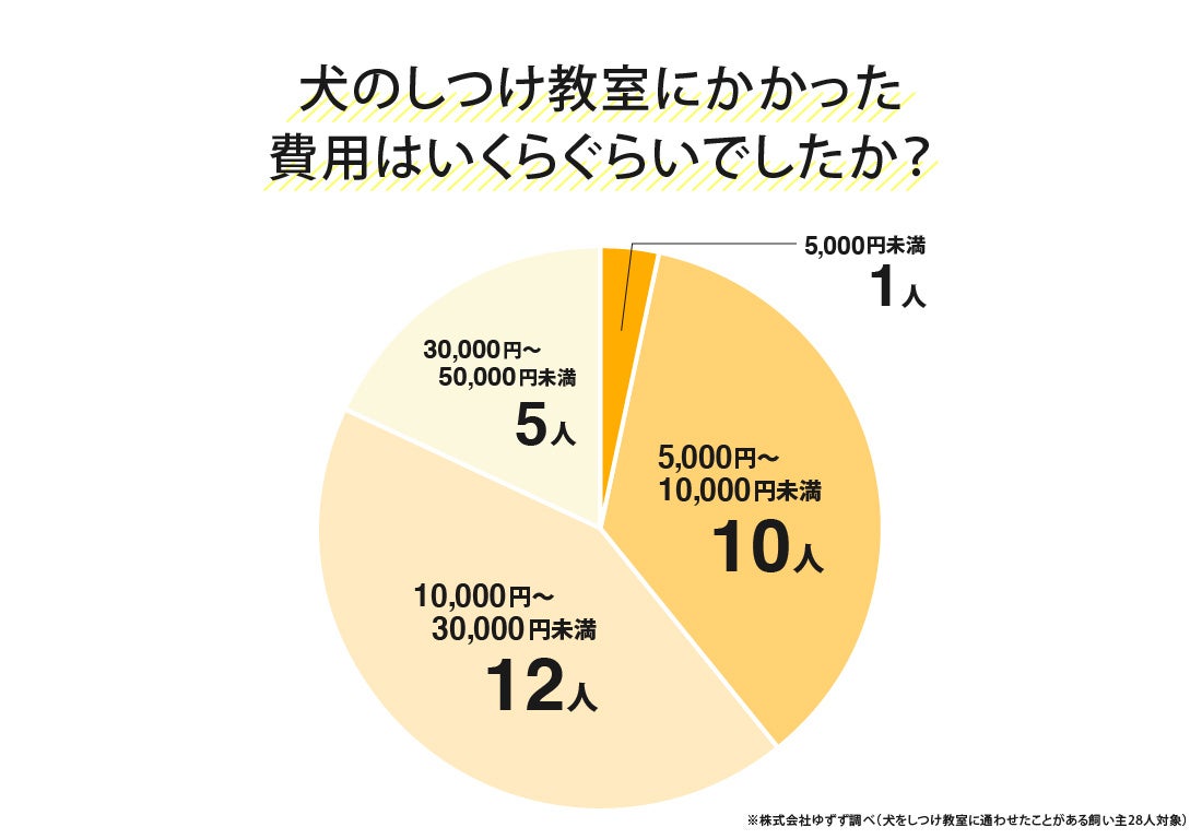 「犬のしつけ教室にかかった費用はいくらぐらいでしたか?」というアンケートをとった結果、「10,000円〜30,000円」と答えた人がもっとも多かったです。