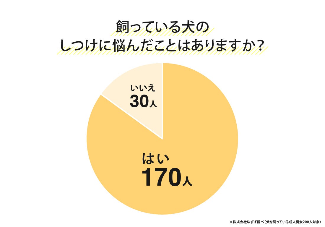 犬を飼っている成人男女200人を対象に「飼っている犬のしつけに悩んだことはありますか?」というアンケート調査を行った結果、全体の8割を超える人が「犬のしつけに悩んだことがある」と答えました。