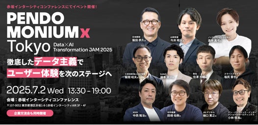 Pendo.io Japan株式会社(東京都渋谷区)は、2025年7月2日(水)に赤坂インターシティカンファレンスにて「PendomoniumX Tokyo - Data×AI Transformation JAM 2025」を開催いたします。本イベントでは「徹底したデータ主義でユーザー体験を次のステージへ」をテーマに掲げ、国内外のトップエグゼクティブや専門家が登壇し、データとAIを活用した顧客体験価値最大化に向けた戦略と実践について、多角的な視点から議論を深めます。