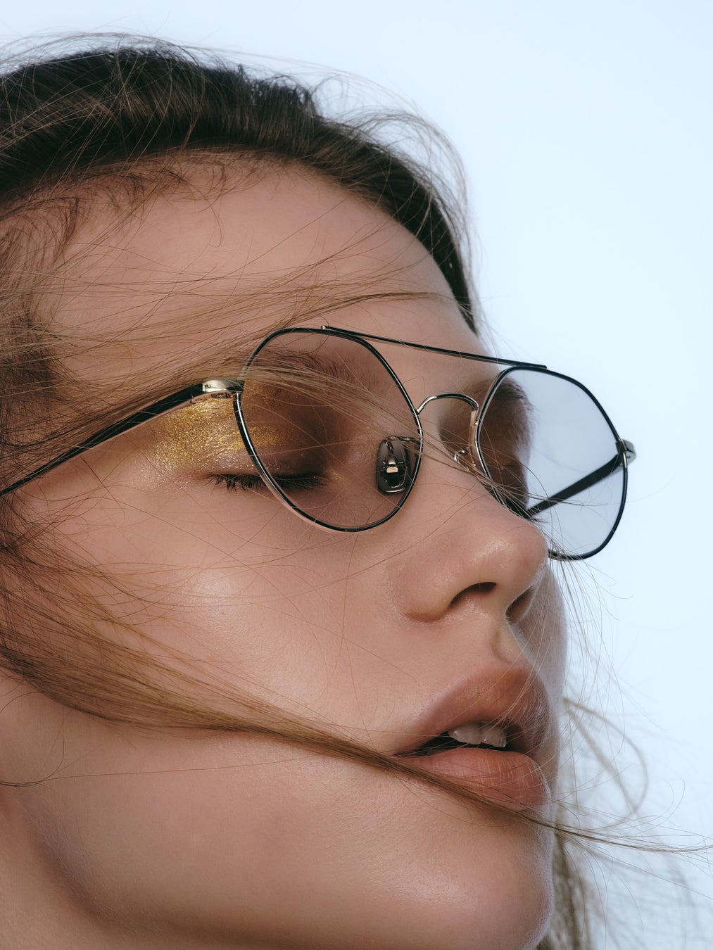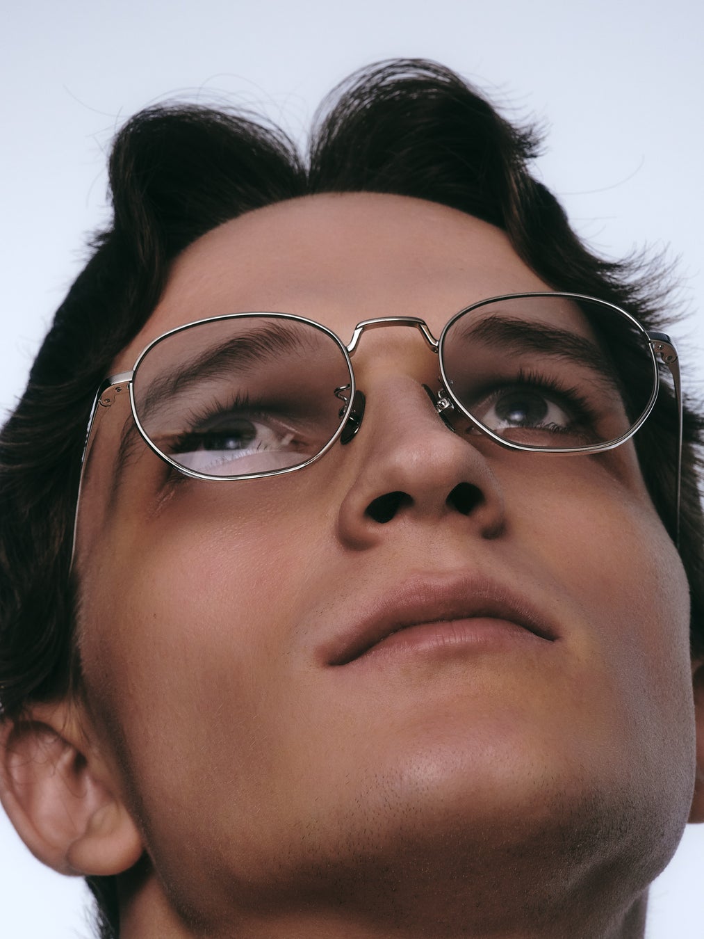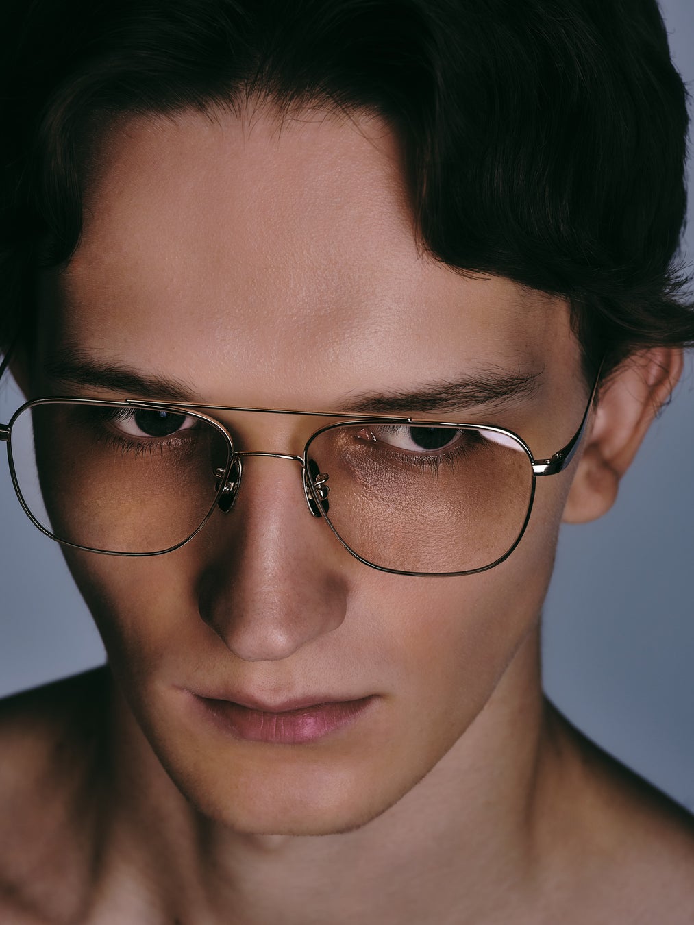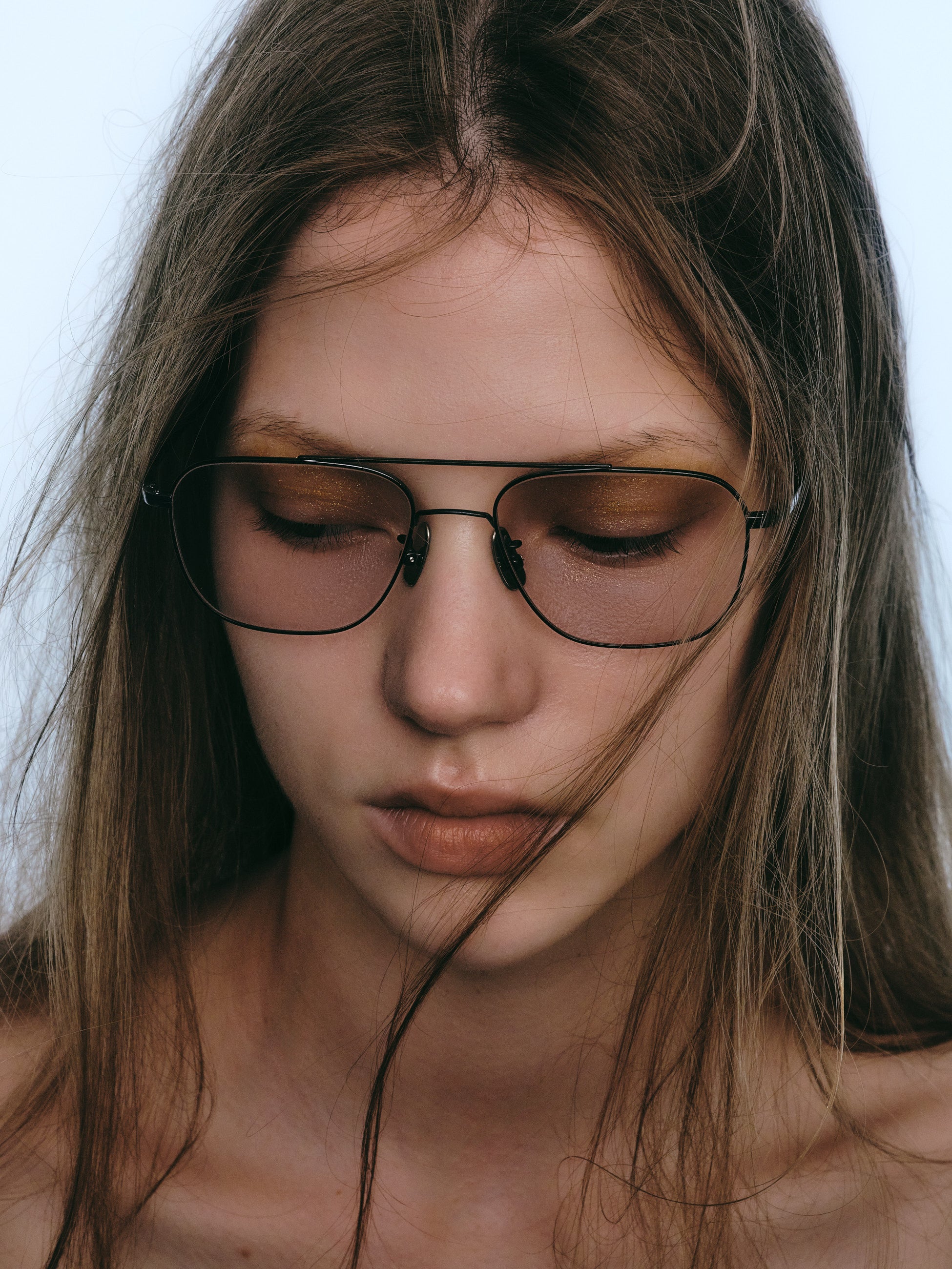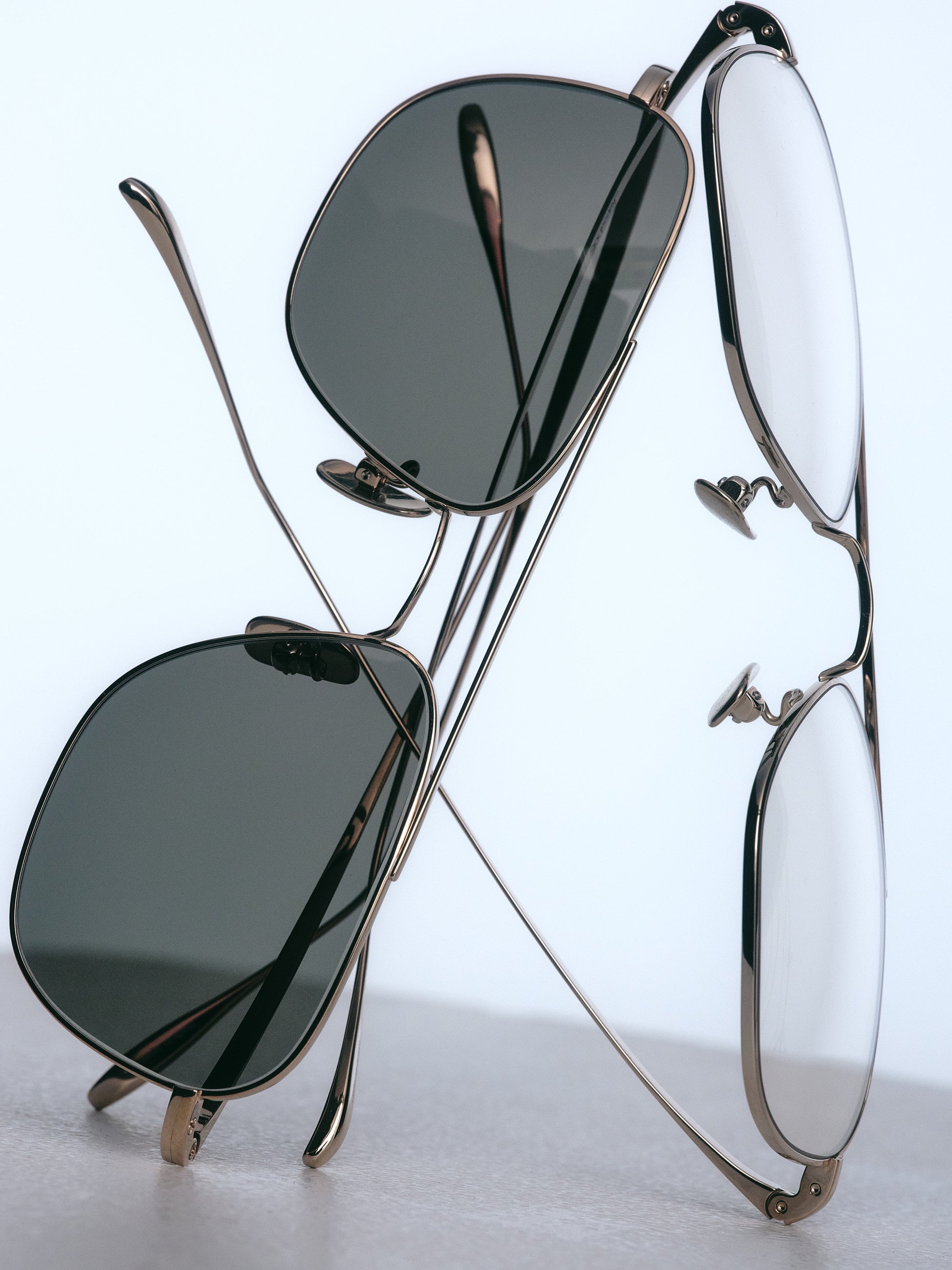 1950年代に流行したダブルブリッジのクラシックな造形を再構築。 素材には、β(ベータ)チタンを採用。