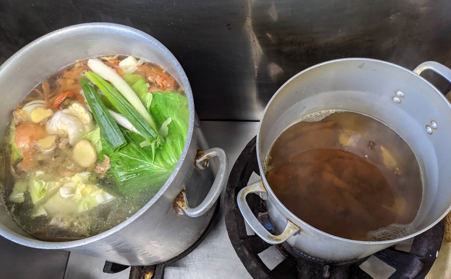 アクがでなくなったら、キャベツ、玉ねぎ、長ネギ、ニンジンなどの野菜を入れます。臭みを抑えるために、ニンニクとショウガを入れて弱火で沸騰しないように2時間程度煮込んで本格的なスープを作っていきます。