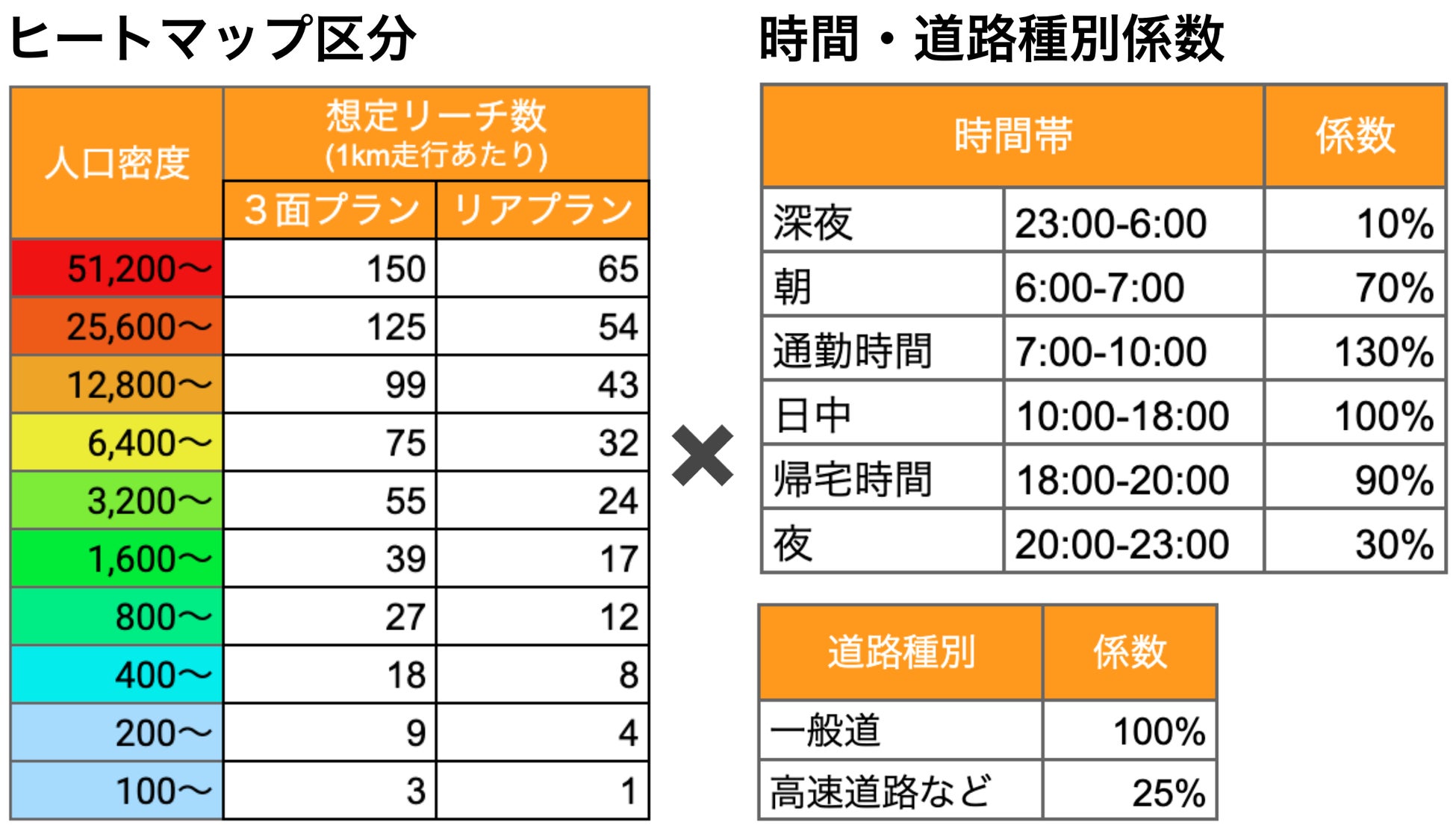 そこで今回、適切な広告効果を測るため、自社開発のGPSトラッキング機能(※)にDIMの「モバイル空間統計」を活用した人口密度を表現したヒートマップ評価、走行時間帯、道路種別(一般道 or 高速道路)を掛け合わせることで、その走行で何人にリーチできたのかを高い精度で算出するシステムを開発しました。広告主は、このリーチ数に応じた報酬システムによって、より堅実で効率的なプロモーションを実施いただけます。また、これまでは人口密度の高い東京や大阪といった割のいい都市部限定のキャンペーンに偏っていましたが、今後は全国のドライバーを対象とした様々なキャンペーンを提供してまいります。