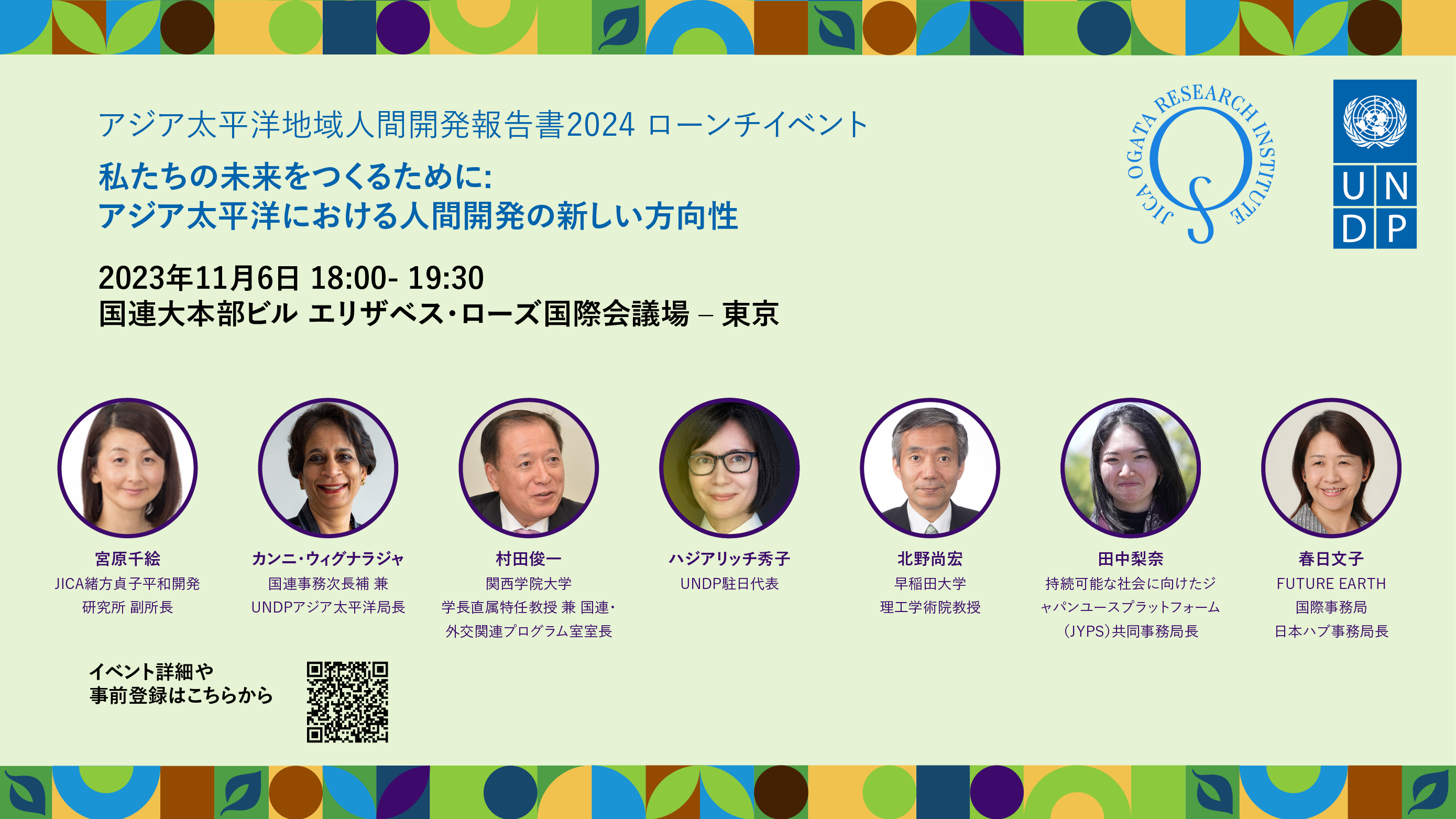 当イベントでは、本報告書の概要をカンニ・ウィグナラジャ 国連事務次長補兼UNDPアジア太平洋局長が紹介するとともに、春日文子 Future Earth 国際本部日本ハブ事務局長、北野尚宏 早稲田大学教授、田中梨奈 JYPS共同事務局長、そして村田俊一 関西学院大学教授をお招きし、アジア太平洋地域における人間開発のあり方について考えるパネルディスカッションも行います。