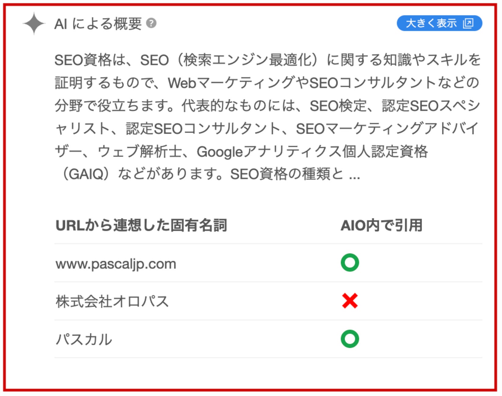 今回パスカルに追加された「AIによる概要」は、指定キーワードごとにAIオーバービューの表示有無と、その中で自社が引用されているかをチェックできるものです。
