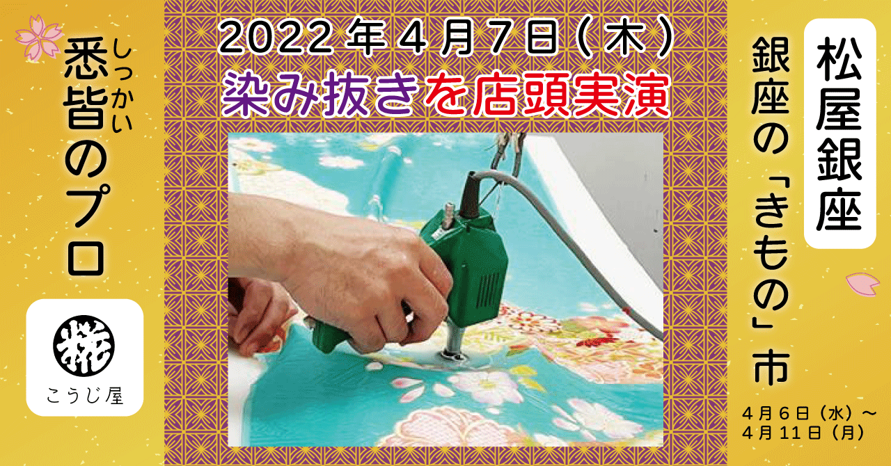 4月7日(木)限定で、お持ち込みいただいた着物の染み抜きを、その場で実演いたします。