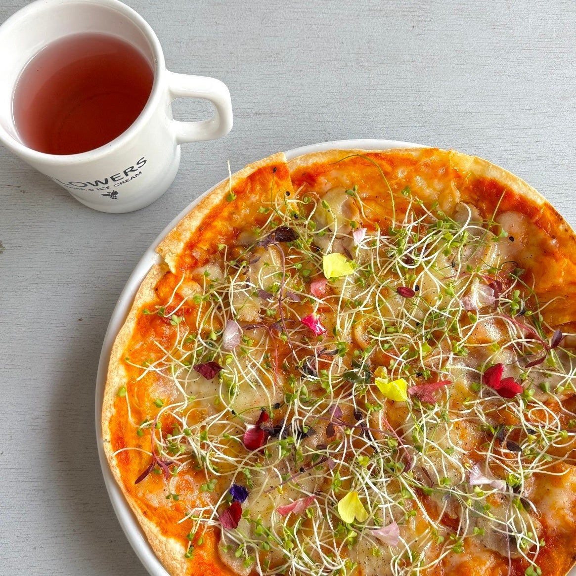 トマトと新鮮野菜でつくられたイタリアの伝統的なトマトソースをベースに塗った生地に、チキンとまろやか且つ芳醇でコクのあるラクレットチーズをのせて焼き上げた、ほんのりナッツの風味香るパリパリ食感ピッツァです。仕上げに彩り豊かなエディブルフラワーを添えました。