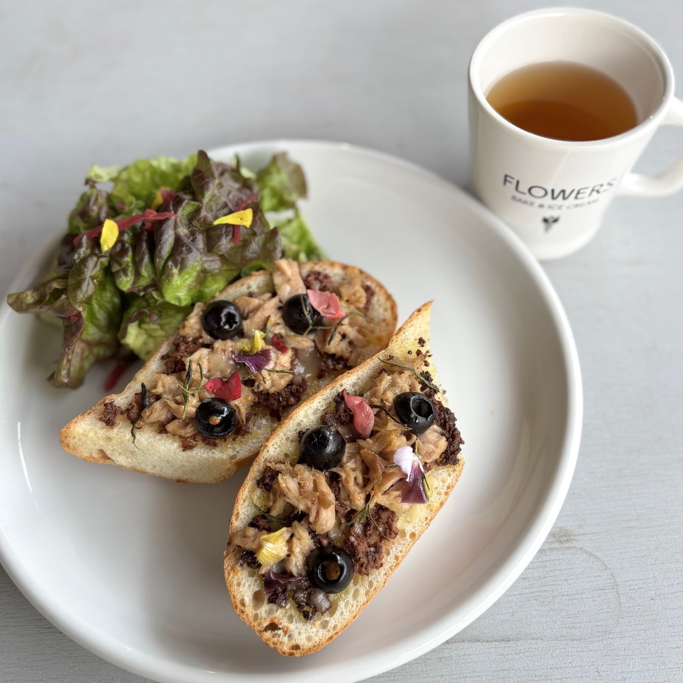 深みのある味わいのタプナードソースとツナ、パルメザンチーズをのせて焼き上げた、ほんのりローズマリーの香り漂うバケットオープンサンドです。仕上げに彩り豊かなエディブルフラワーを添えました。
