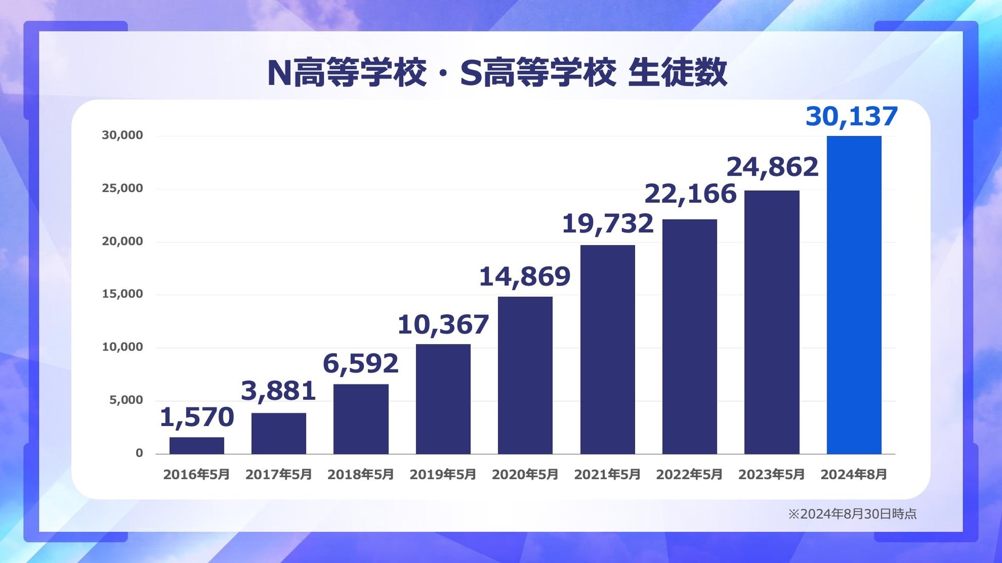 学校法人角川ドワンゴ学園N高等学校・S高等学校(以下、N/S高)は、2024年8月30日時点の在籍生徒数が30,000名を突破したことをお知らせします。