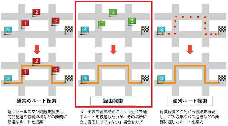 「業務用カーナビSDK Ver.10.0」では、目的地として立ち寄らない場所をルート設定用の経由地として設定してルート探索を行う経由探索機能を実装しました。複雑なルートを設定したいが経由地自体への案内は不要というニーズにお応えした、通常のルート探索と点列ルート探索の中間に位置する機能です。