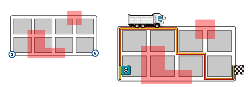 回避エリアルート探索:進入を避けたいエリアを指定して、資材搬入や警備業務などに対応したルート探索を行います。
