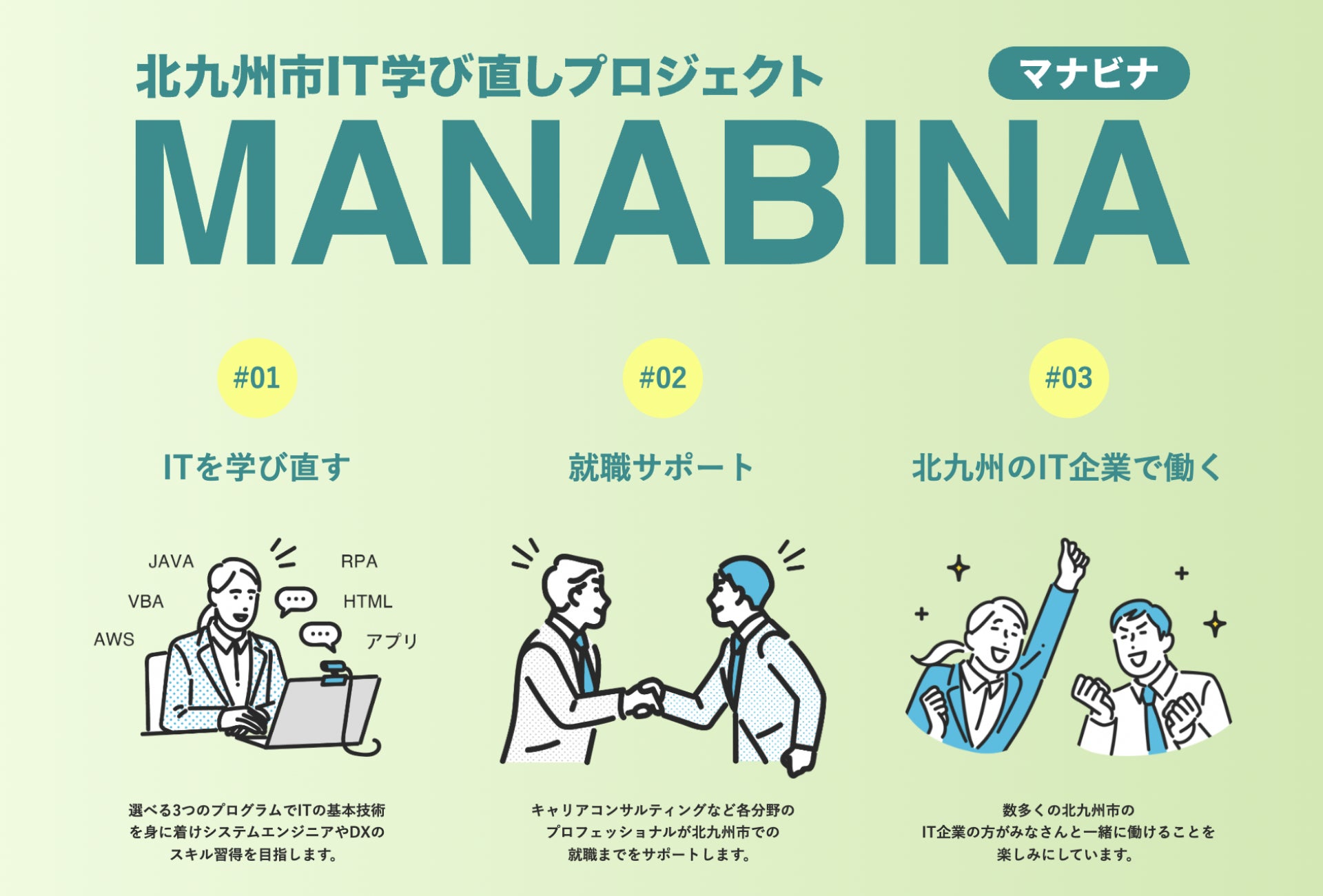今年はその育成・採用支援事業である【MANABINA - 北九州市IT学び直しプロジェクト】をスタートしました。そして今回は、MANABINAの一環として【でじまる - まるっとデジタル・ビジネススキル学習プログラム】の受講生を募集いたします。