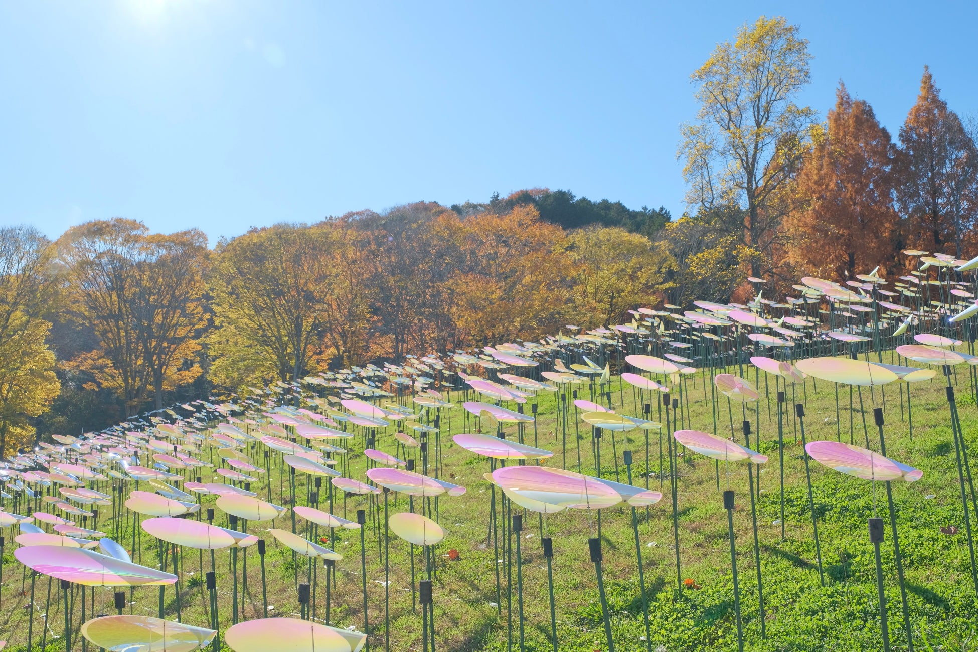 広々とした芝生のグリーンヒルに設置された2000本の風見鶏によりモビールスケープ。風に揺られると、日中は陽の光を受けてキラキラと輝き、夜は幻想的な灯りで園内を彩る。自然の中で風と光が生み出す景色と出会う、小松宏誠氏のインスタレーション「風の花びら」。