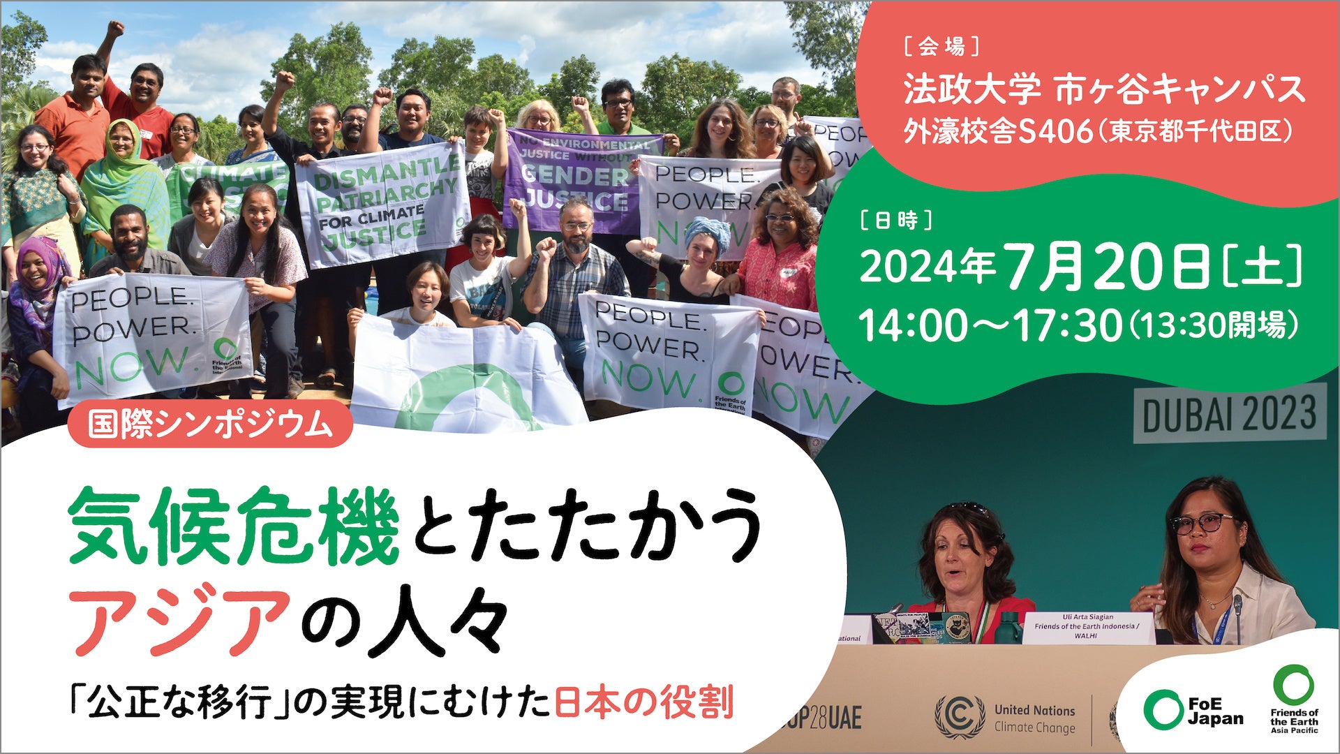 世界73ヵ国のネットワークを有する国際環境NGO FoE Japanは、法政大学と共催で【国際シンポジウム】気候危機とたたかうアジアの人々〜「公正な移行」の実現にむけた日本の役割〜を開催します。アジア各国の気候変動運動の最前線で活躍する人々が来日し、生の声を直接聞くことのできる貴重な機会です。登壇者への個別取材も可能です。是非、ご参加・ご取材いただけますと幸いです。