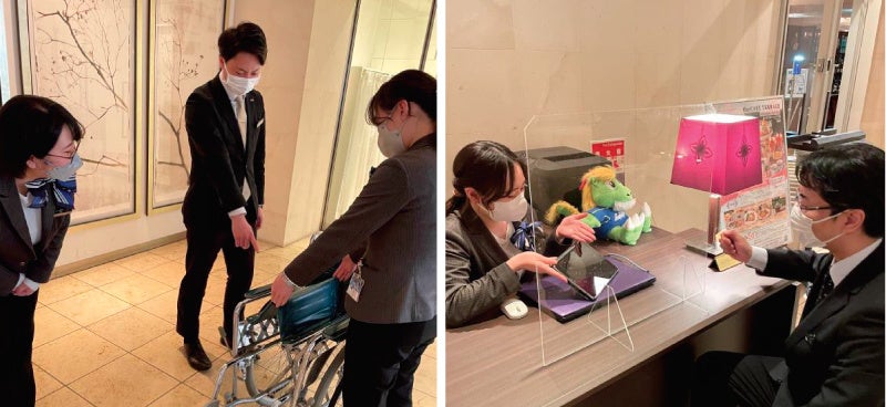 具体例として、車椅子の貸出及びアシスト、シャワーチェアの貸出、段差の少ない施設/客室設計、筆談機能のあるタブレット配置の他、社員のバリアフリー接遇研修を通して、サービススタッフの意識とスキル向上に努めております。