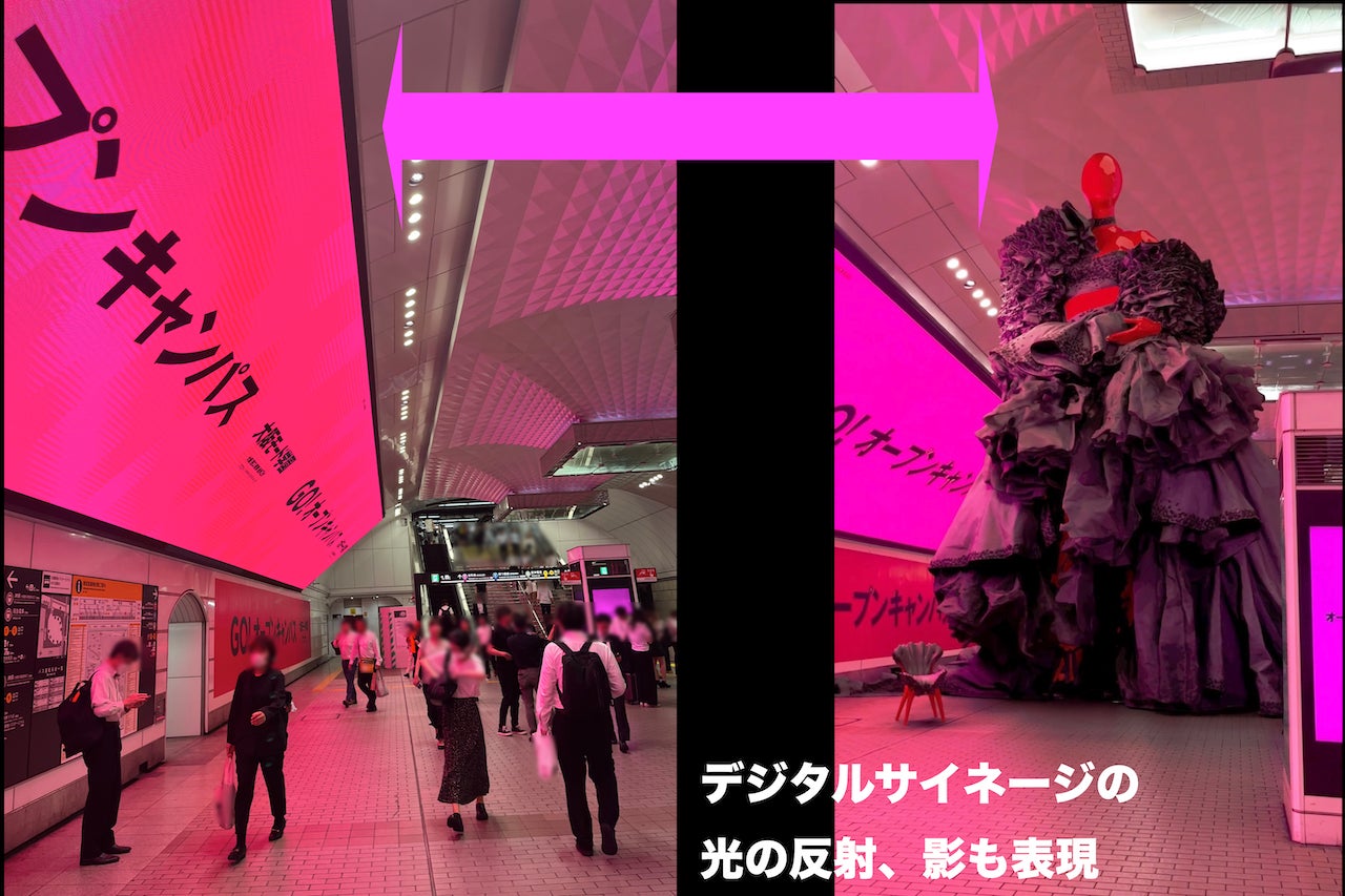 本作品は、大阪モード学園と大阪メトロアドエラによるプロジェクトで、Osaka Metro梅田駅の「梅田プレミアムPlus」に出稿された実際のOOH広告に、学生が制作したファッションデザインと、AIによって生成された3DオブジェクトをCG合成した「シュールOOH/CGI動画」を制作。ARやプロジェクションを使用せず、CGIで“現実にありそうな錯覚”を生み出し、広告が設置された場所・時間を超えて広がる新たな体験を提供しました。