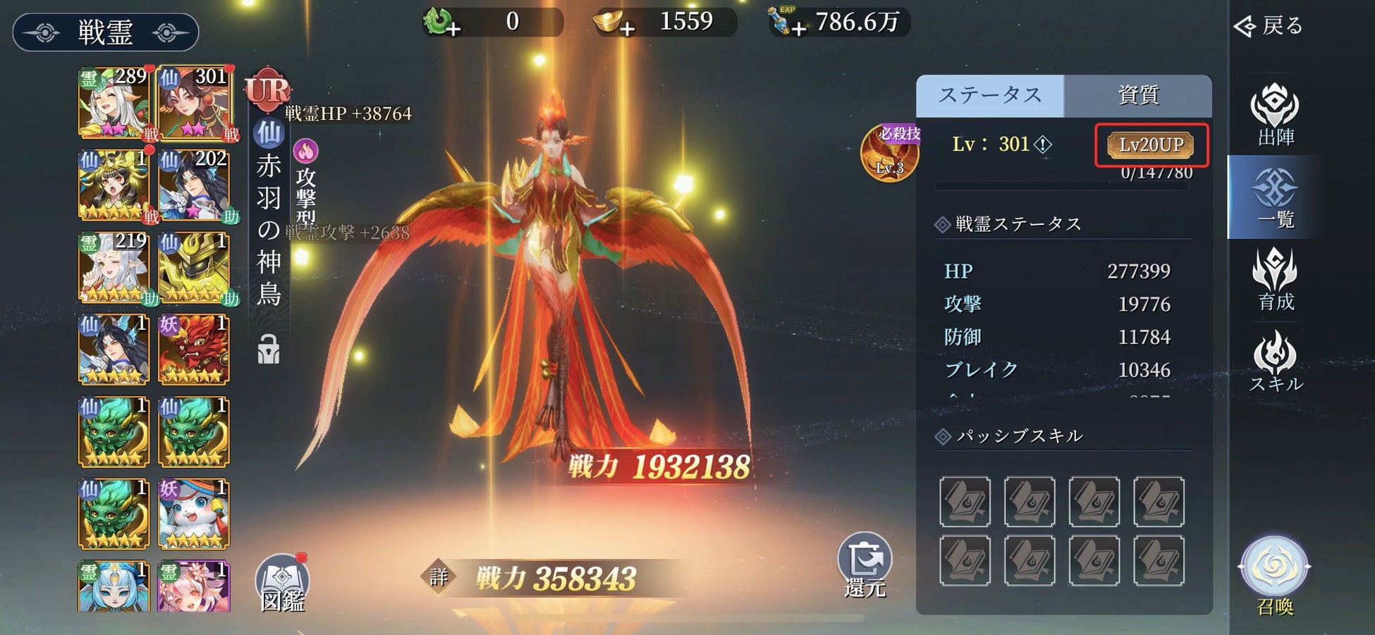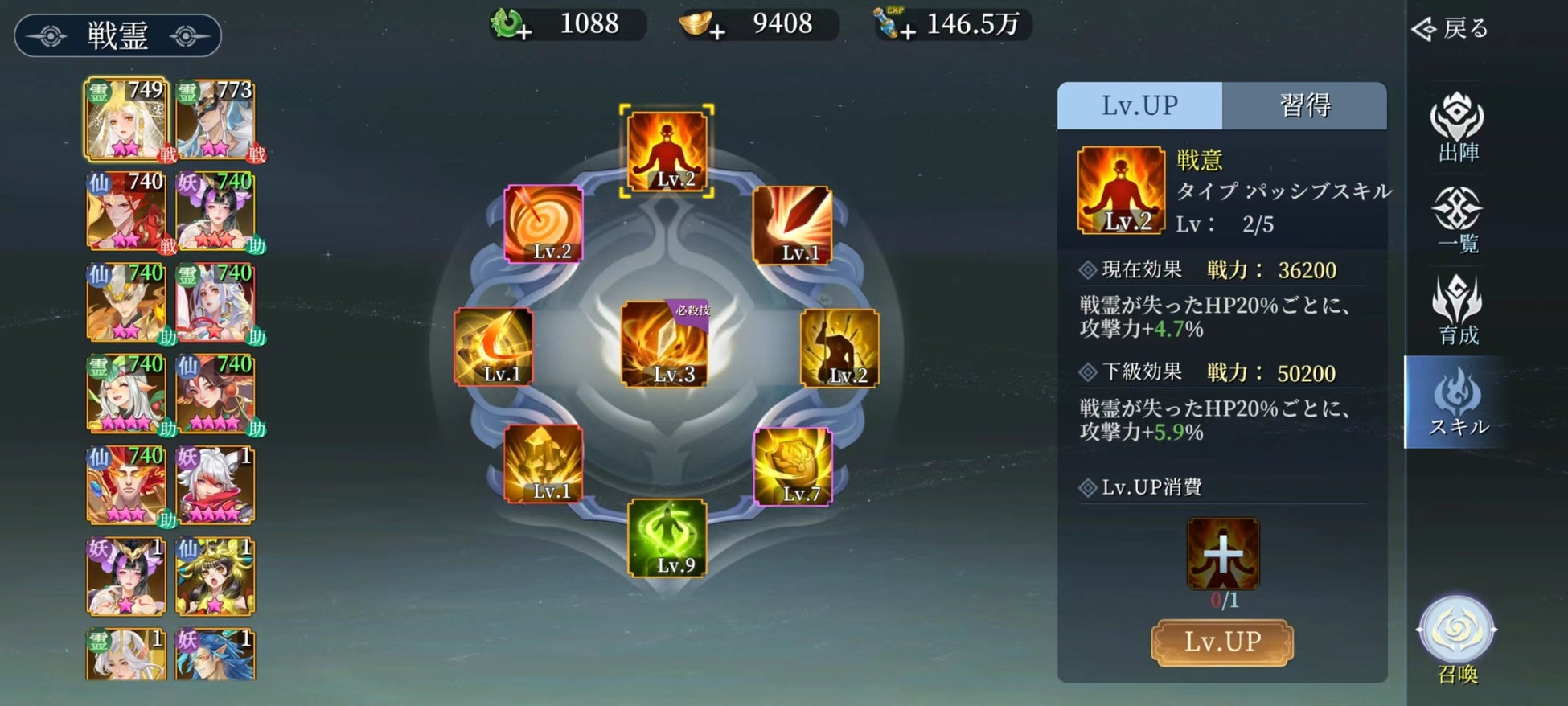 一覧画面では戦霊のレベルをアップさせることができます。Lv.20UPボタンを押すと、簡単にレベルが上げられます。