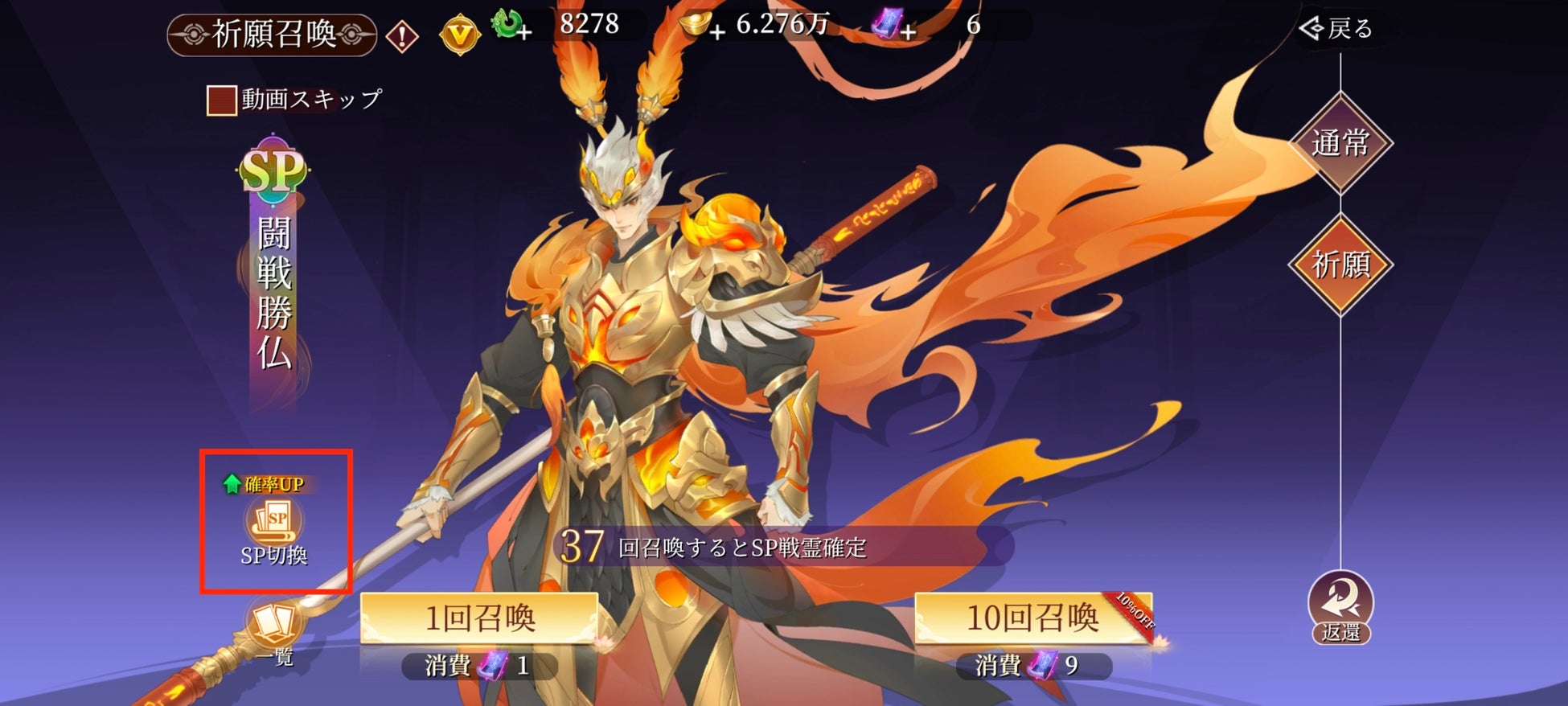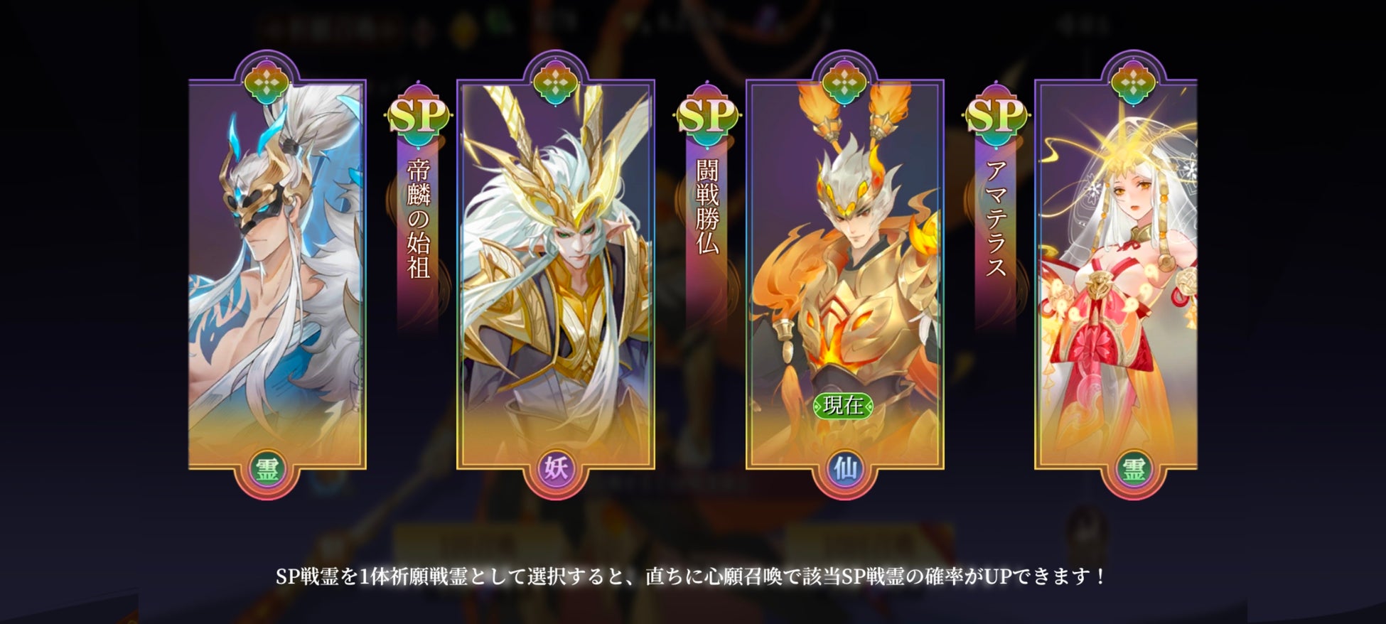 以前は順次該当の4体のSP戦霊が1週間ずつピックアップされ、終了した戦霊のガチャは引けない仕様でございましたが、今回のアップデートより、サーバー開始36日以上であれば、プレイヤーが自身でピックアップ対象の戦霊を選ぶことができるようになりました。よって、お目当てのSP戦霊を狙って召喚にチャレンジすることが可能となりました。