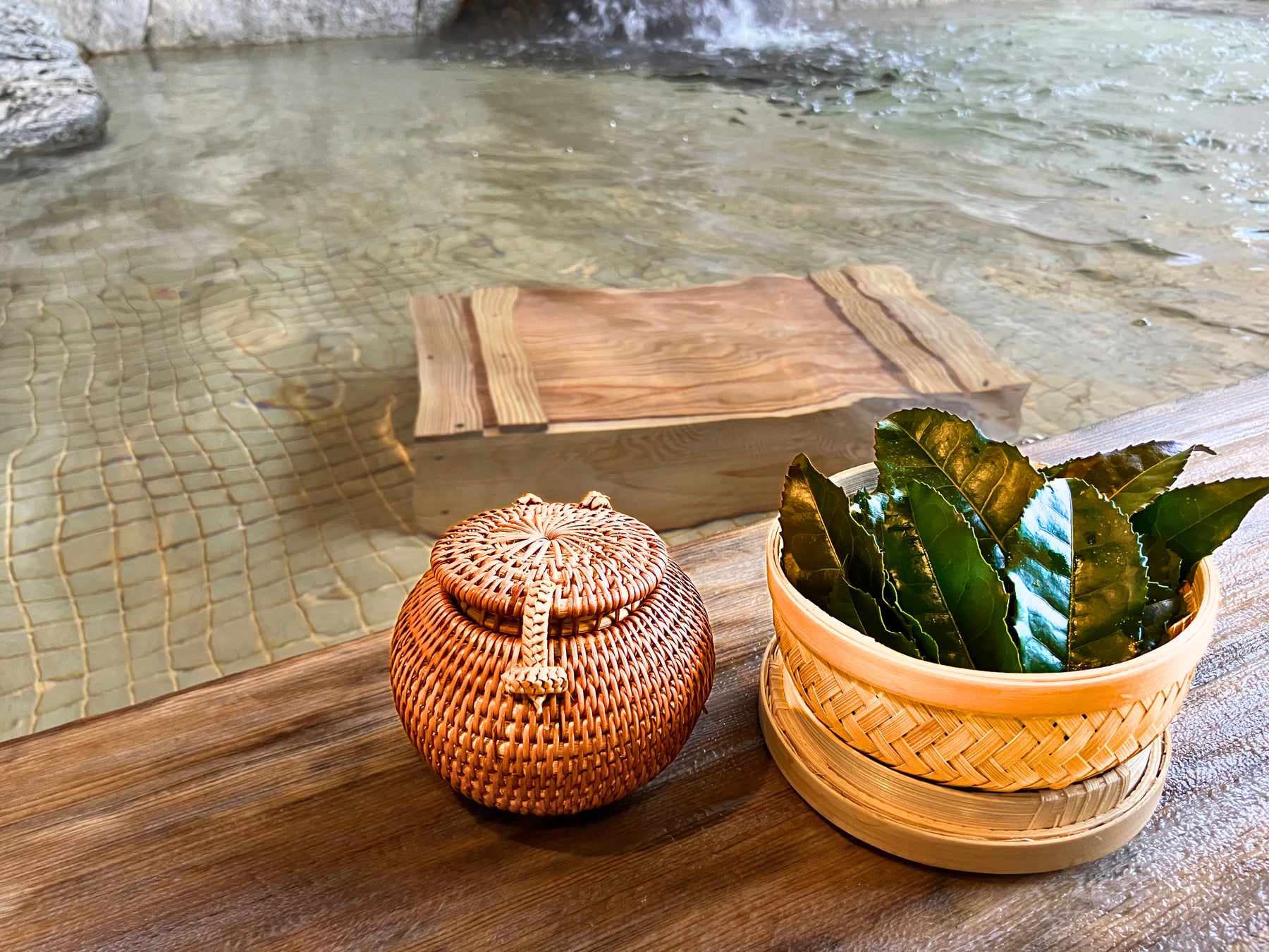 庭園露天風呂では、奥久慈茶の茶葉を木箱に入れて湯船に浮かべる「お茶風呂」をご用意いたします。
