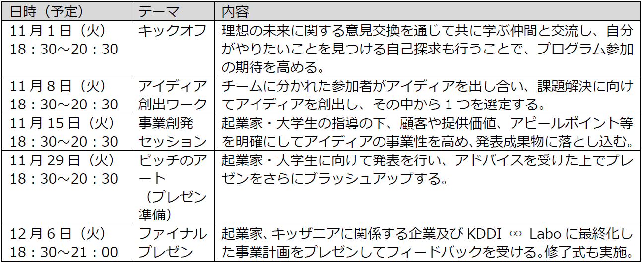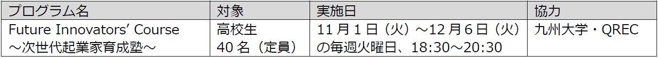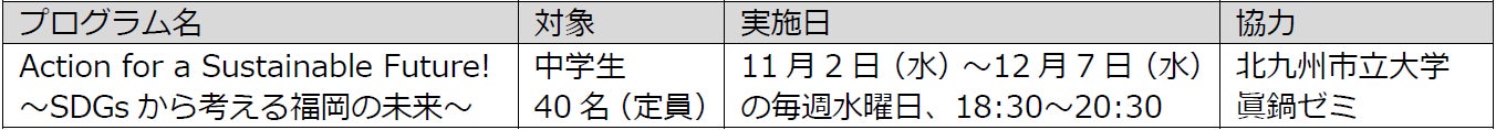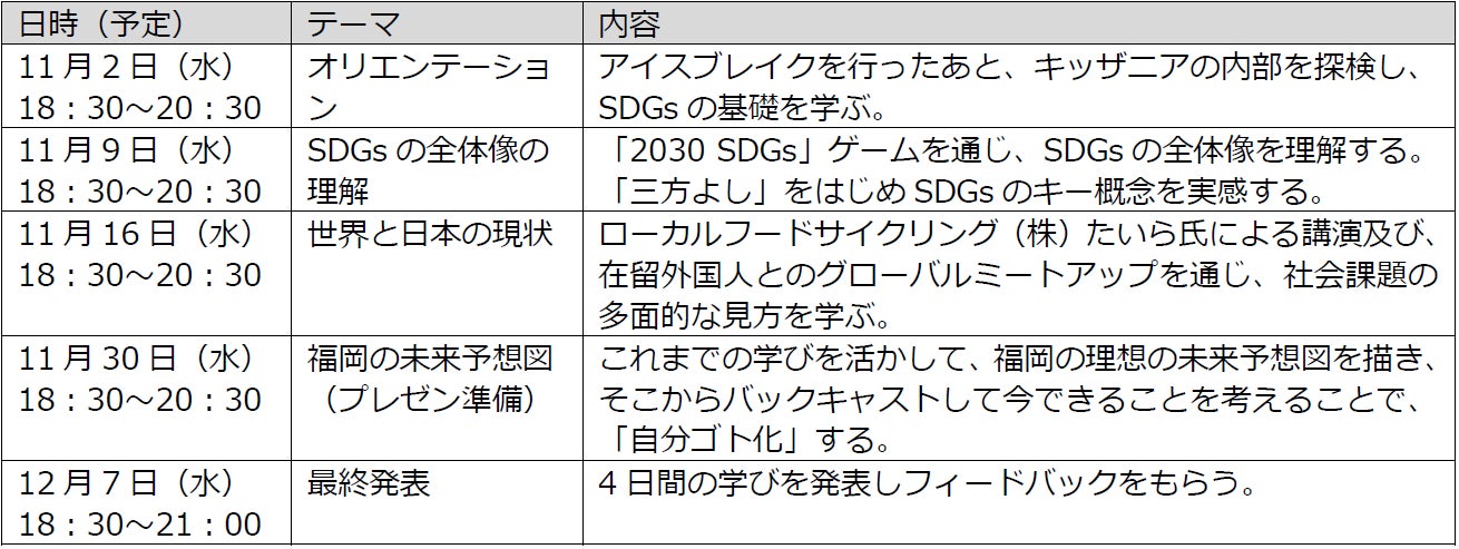 本プログラムは、キッザニアの他拠点に先駆けて福岡ならではの「グローバル」や「スタートアップ」をテーマにした取り組みとして、一般向け営業時間終了後である夜時間帯の「キッザニア福岡」を会場に行います。高校生向けには「Future Innovators’ Course ~次世代起業家育成塾~」を、中学生向けに「Action for a Sustainable Future! ~SDGsから考える福岡の未来~」を実施します。