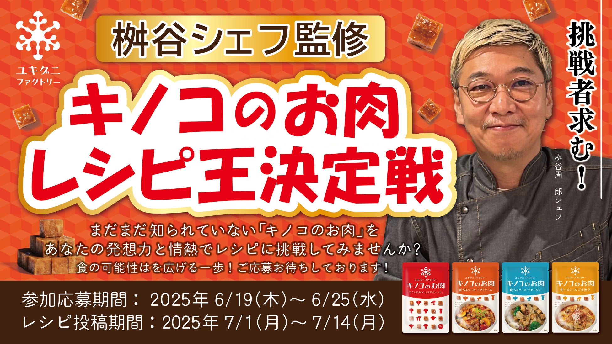ユキグニファクトリー株式会社(本社:新潟県南魚沼市 代表取締役社長:湯澤尚史)では、「大阪・関西万博」にて“未来食”として紹介された「キノコのお肉」を使ったレシピを募集し、優秀作品を決めるレシピコンテスト「キノコのお肉レシピ王決定戦」を開催します。