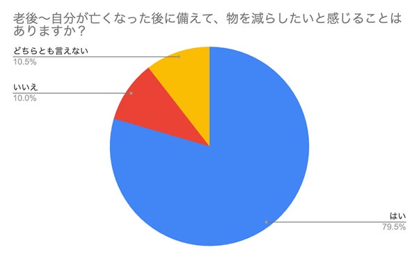「老後~自分が亡くなった後に備えて、物を減らしたいと感じることはありますか?」と伺ったところ、「物を減らしたい」と回答した人が全体の8割近くに上りました。