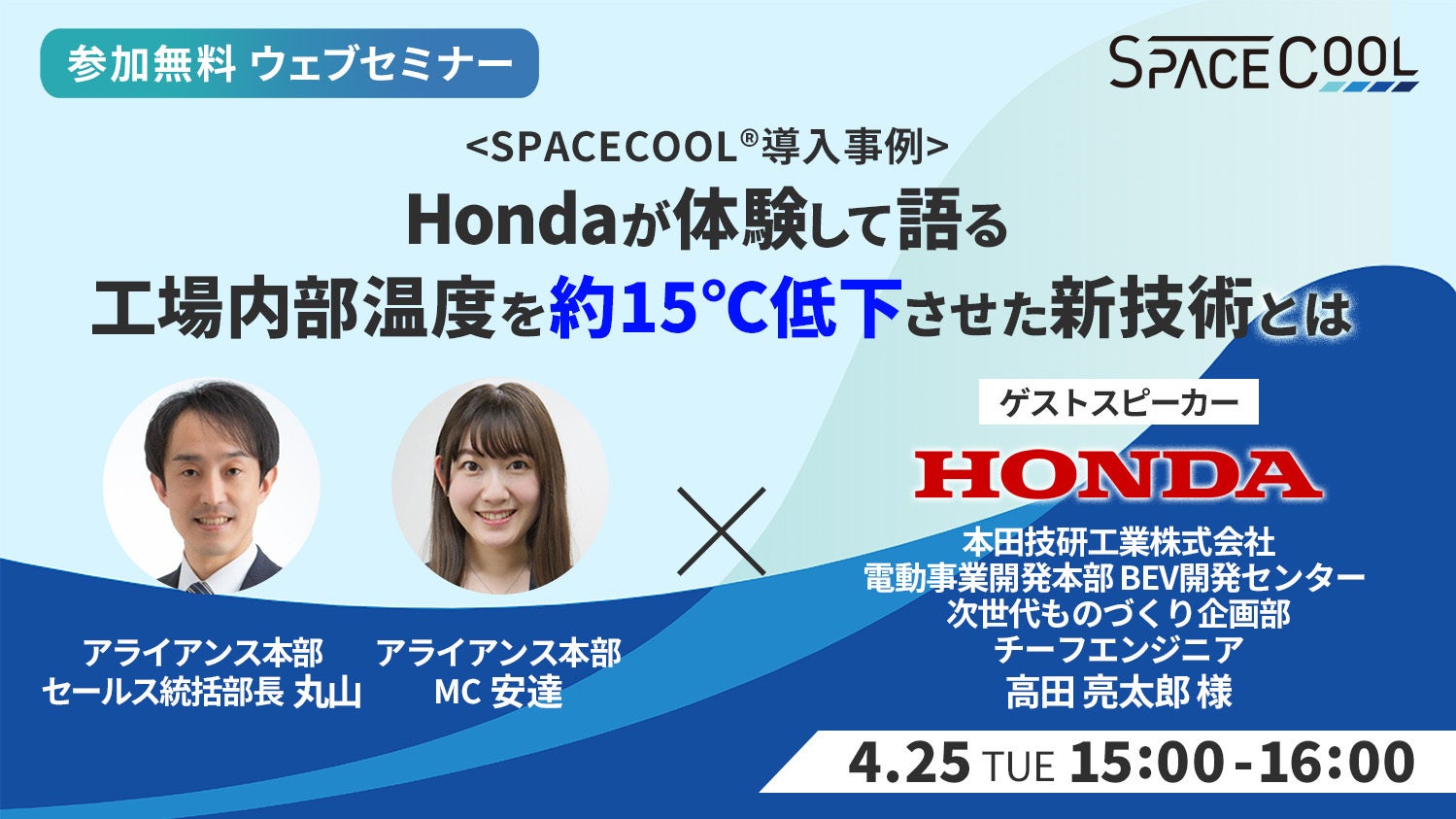 SPACECOOL 株式会社(代表取締役社長:宝珠山 卓志)は、自社工場設備へ実際に施工し、実証実験にもご協力いただいた本田技研工業株式会社様をお招きして、建物屋根・コンテナへの施工に関する疑問解消、脱炭素社会における省エネ対策をご紹介するウェビナーを4月25日(火)に開催します。