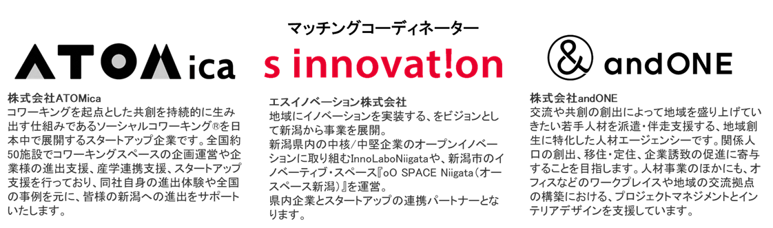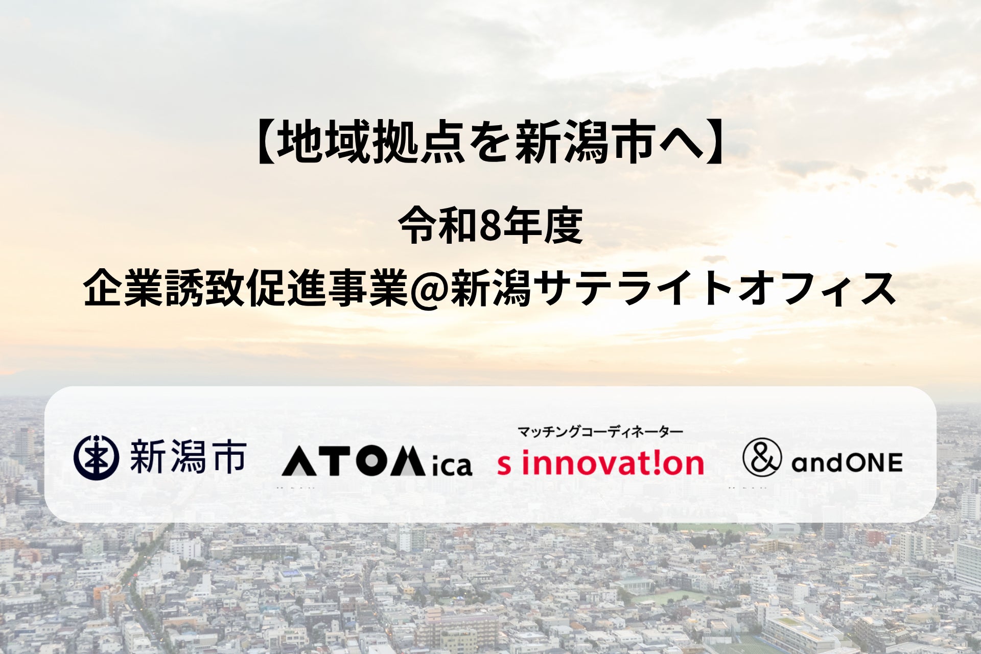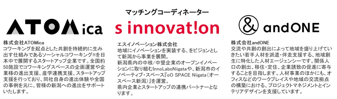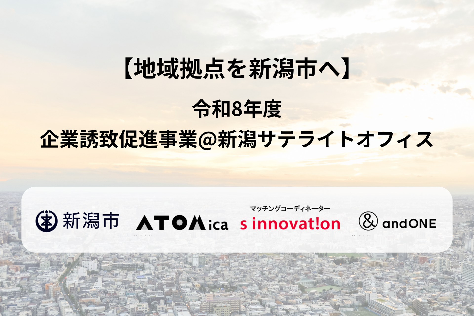 地域イノベーションを推進するエスイノベーション株式会社(本社:新潟県新潟市、代表取締役 星野善宣、以下「エスイノベーション」)は、新潟市、コワーキングスペースを全国展開する株式会社ATOMica(本社:宮崎県宮崎市、代表取締役Co-CEO 嶋田瑞生)、地方自治体向けの地域活性化支援を行う株式会社andONE(本社:東京都中央区、代表取締役社長 長尾成浩)と連携し、「企業誘致促進事業@新潟サテライトオフィス」を通して、新潟を面白くする企業の拠点開設・地域連携を支援します。